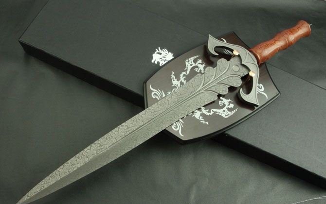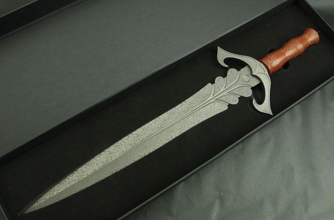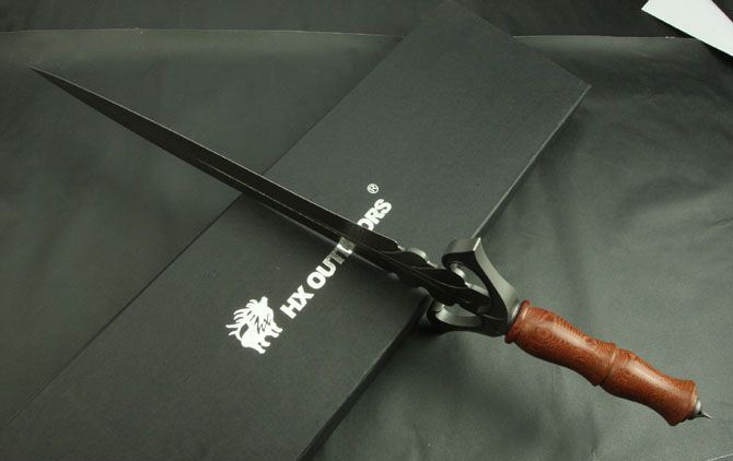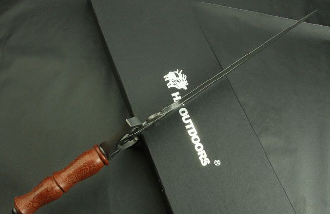 汉道复古欧式长剑 全 长:700mm 刃 长:415mm 柄 长:150mm 刃 宽:62mm 刃 厚:5mm 刃 材:5Cr13Mov 重 量:1600g(含包装) 硬 度:57HRC 表 面:灰钛腐蚀 柄 材:尼龙亚麻 锁 型:定锁 其 他:配牛皮套和黑色硬纸盒
