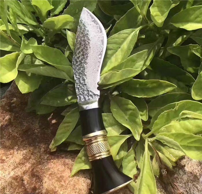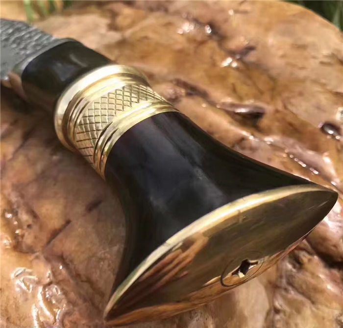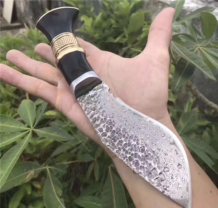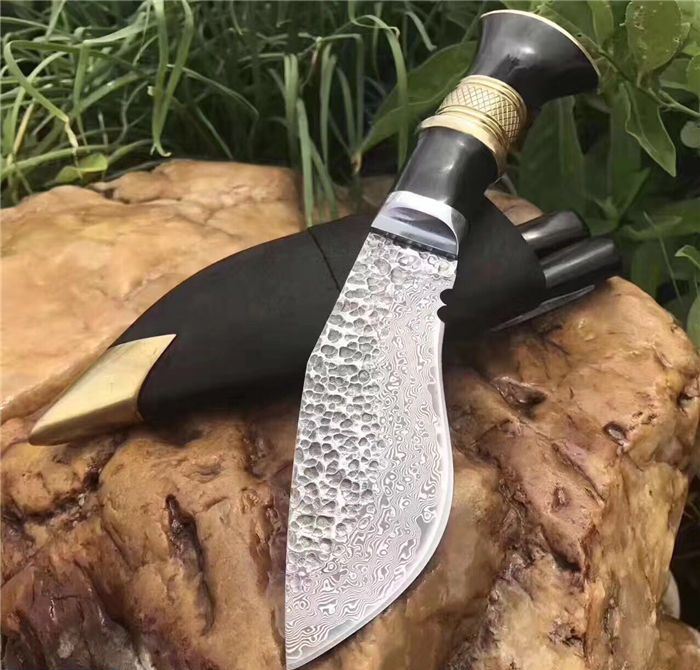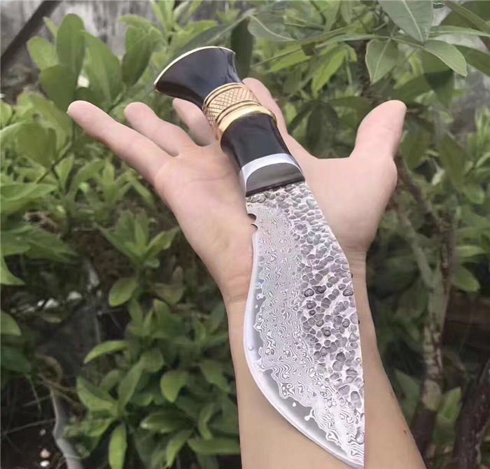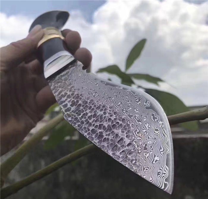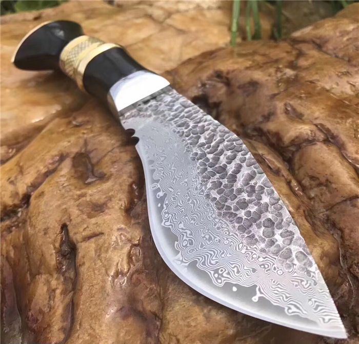 大马士革战狼弯刀 全 长:23.0cm 刃 长:12.0cm 柄 长:11.0cm 刃 厚:4.0mm 刃 宽:4.0cm 刃 材:进口Vg10大马士革 硬 度:59-60HRC 重 量:约600克(含包装) 表 面:锻打凹凸大马士革祥云纹原色 柄 材:天然黑彩木+黄铜+不锈钢 配 送:高级礼品盒+原装皮套+磨刀石+两把小刀