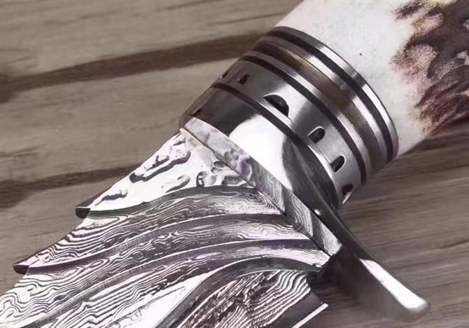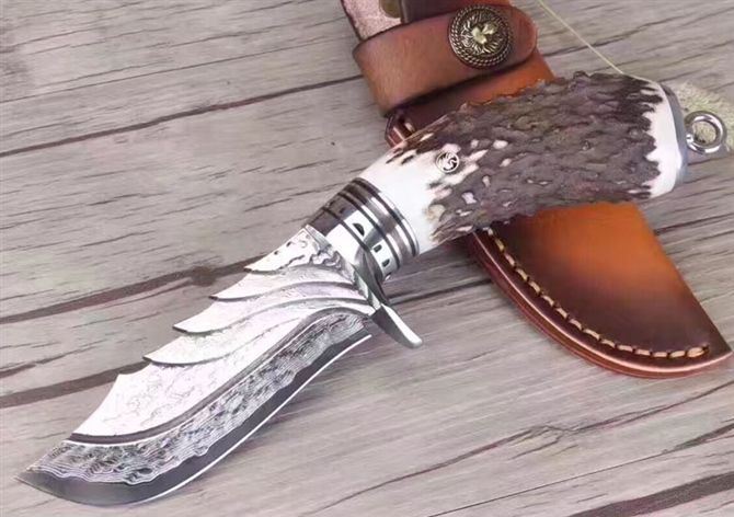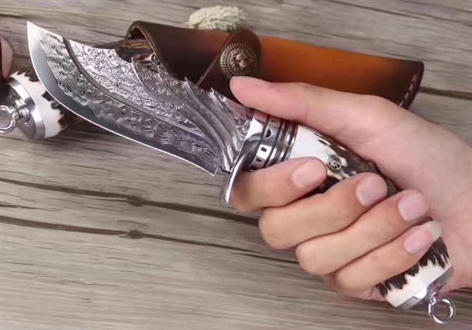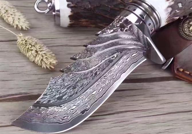 大马士革天使猎刀 全长:21cm 刃长:9.9cm 刃厚:4.5mm 硬度:60HRC 重量:约350克(含包装) 表面:锻打大马士革祥云纹原色 柄材:天然鹿角+黄铜+钢头雕花 配送:皮套