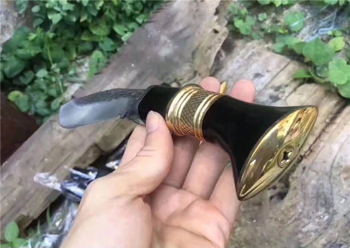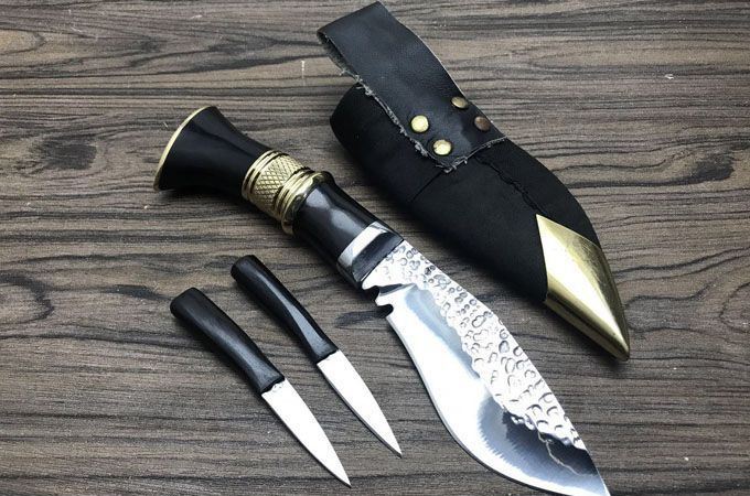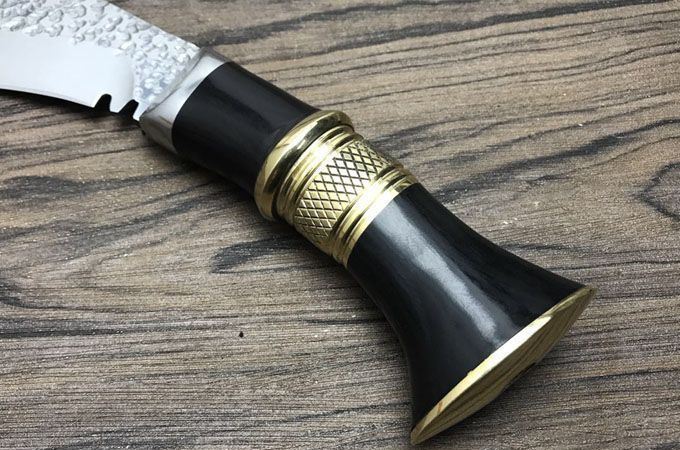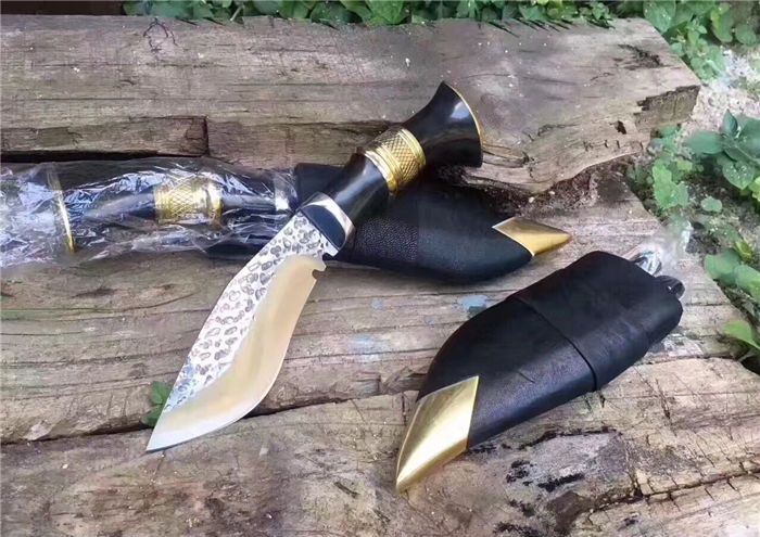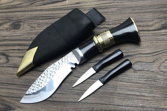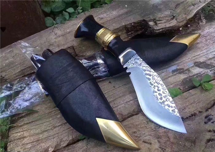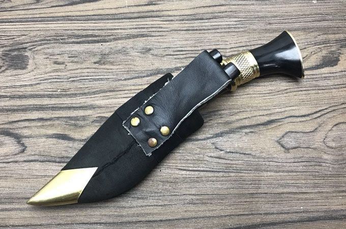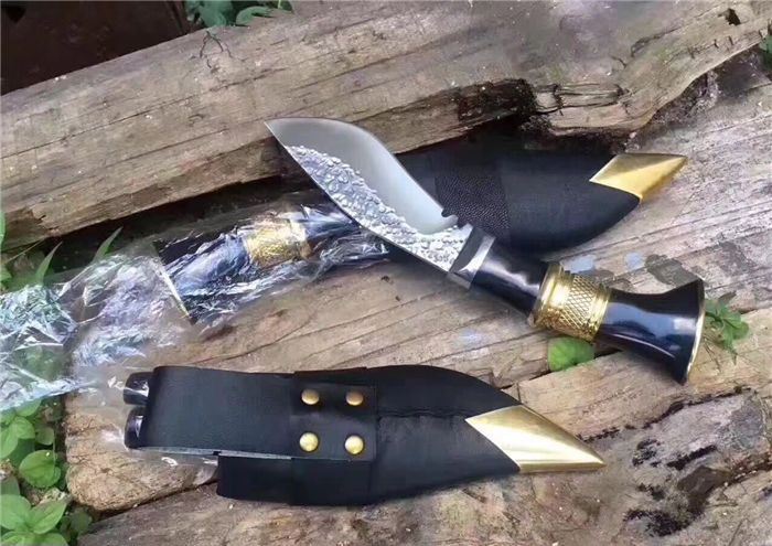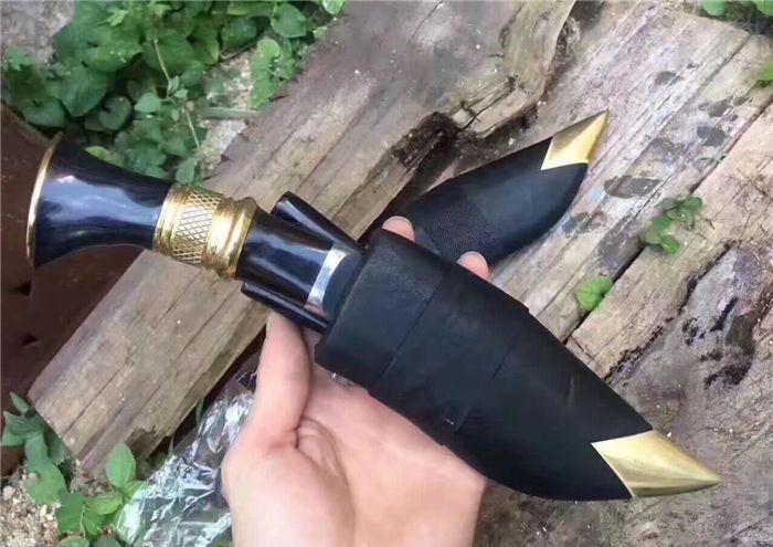 廓尔喀小泥鳅弯刀 全长:23cm 刃长:11.5cm 刃宽:4cm 柄长:115 刃厚:0.4 刃材锻打弹簧钢 装具 黄铜 配送:牛皮刀鞘一个,辅刀两把