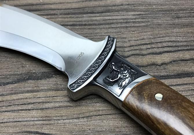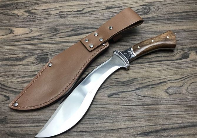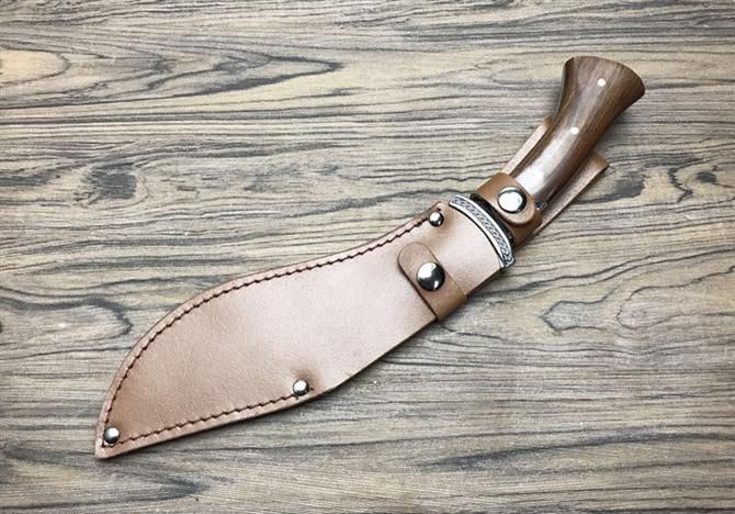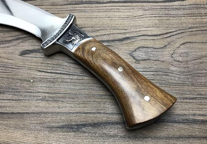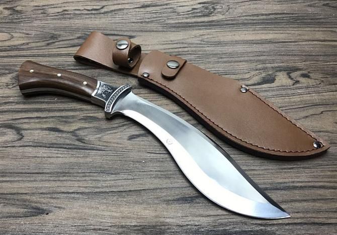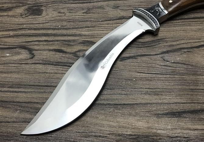 哥伦比亚A3205狗腿弯刀 全长:33.5cm 刃长:21.5cm 刃厚:4.9mm 刃宽:5.2cm(最宽处) 刃材:8铬 硬度:57HRC 刀重:600克 表面:镜光 柄材:钢+檀木 结构:一体龙骨 刀鞘:牛皮