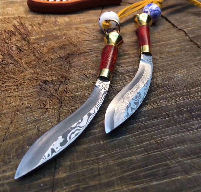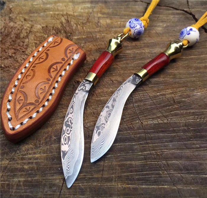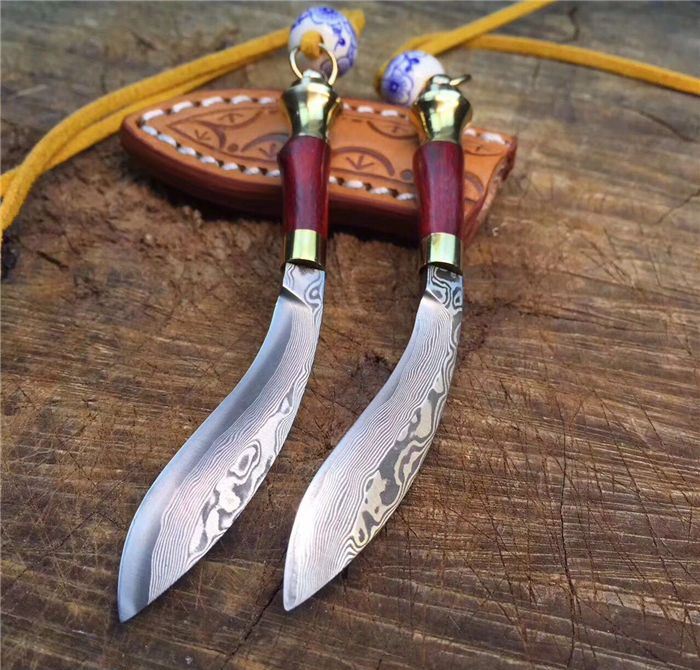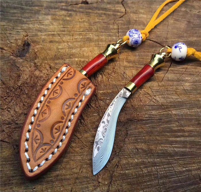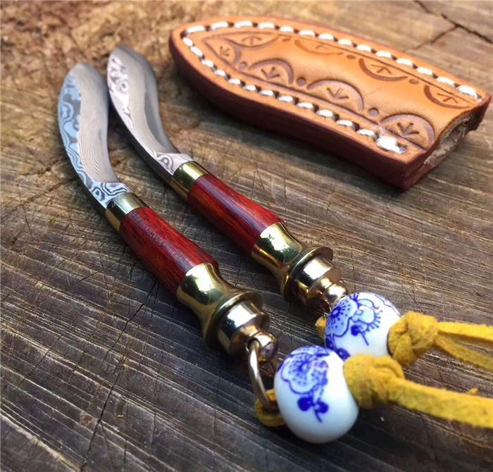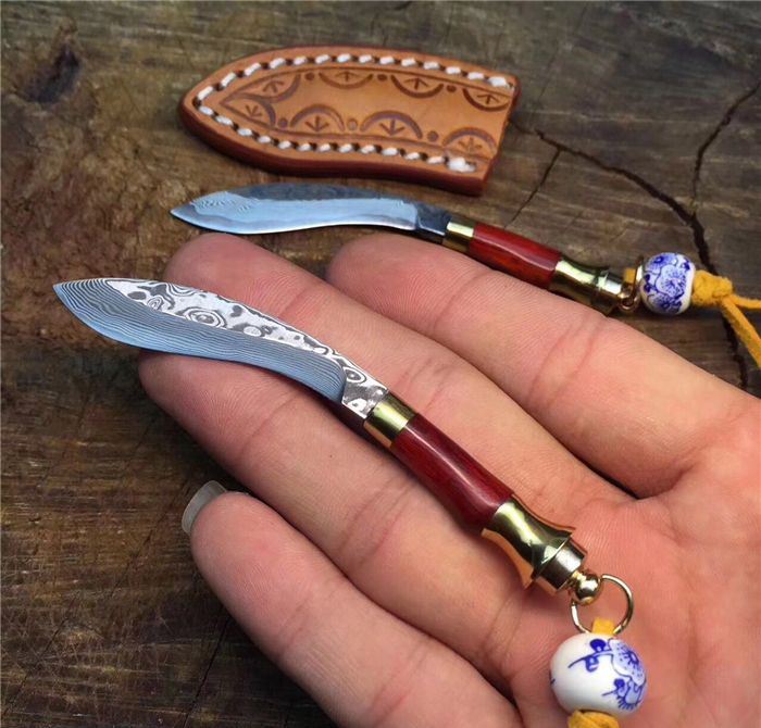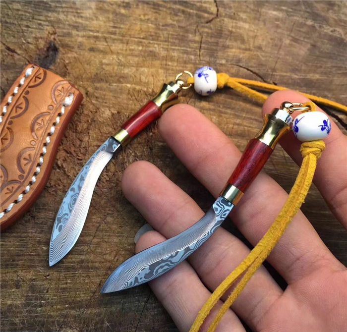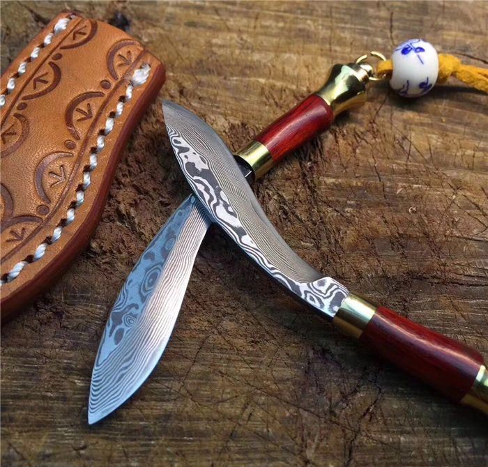 迷你小天狗-大马士革钢 全长:9.5cm 刃长:5.5cm 手柄长:4cm 刀刃厚度:2.5mm 硬度:59HRC 刃材料:大马士革钢高硬度 手柄材料:纯黄铜+大叶檀木+钥匙圈 包装 配置:手工雕花皮刀套+皮绳+珠子超迷你小天狗、数量有限、出完为止