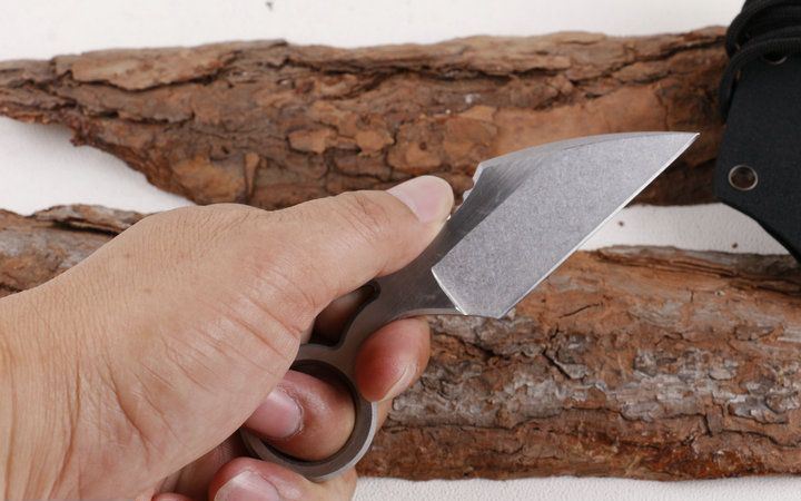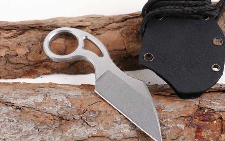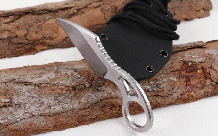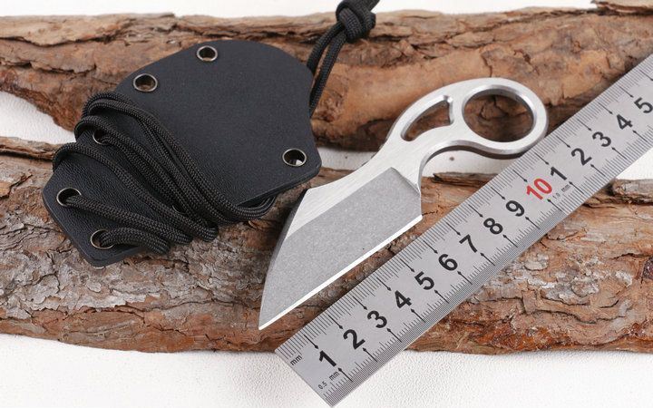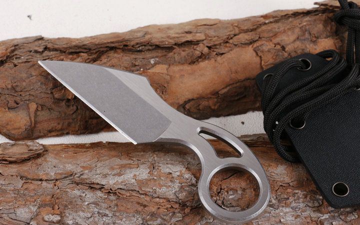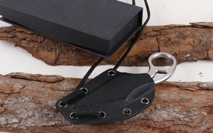 伞绳随身防卫爪刀 全 长:13.0cm 刃 长:7.2cm 柄 长:5.8cm 刃 宽:3.2cm 刃 厚:5.3mm 刃 材:440C 刀 重:75g 重 量:155g(含包装) 硬 度:58HRC 表 面:拉丝伴石洗 柄 材:一体钢 锁 型:定锁 其 他:K鞘+黑色礼品