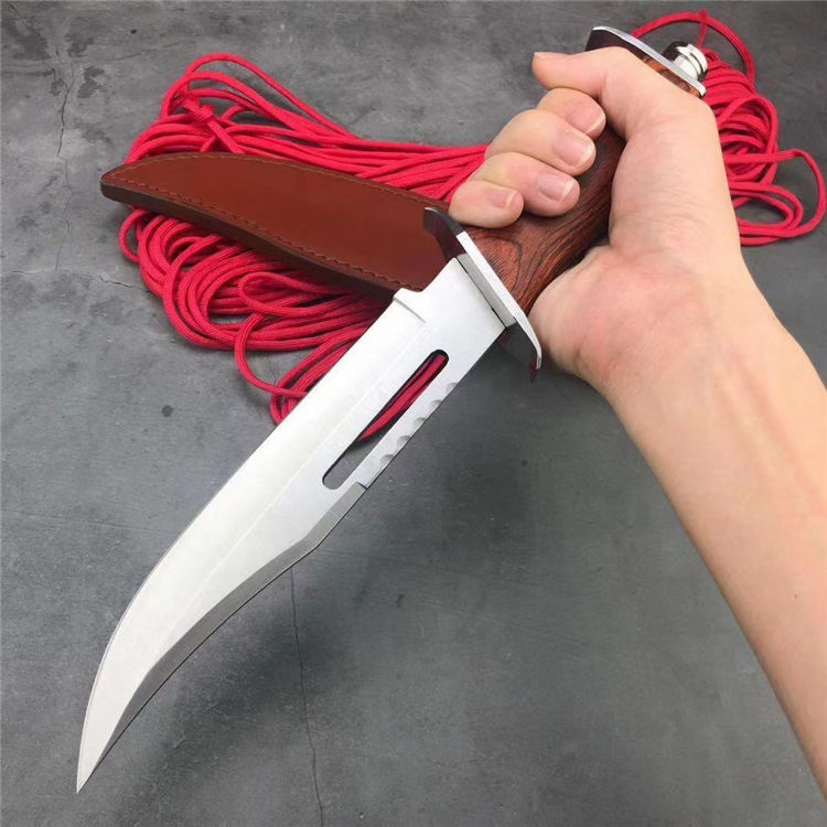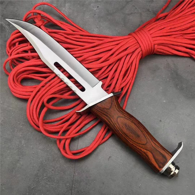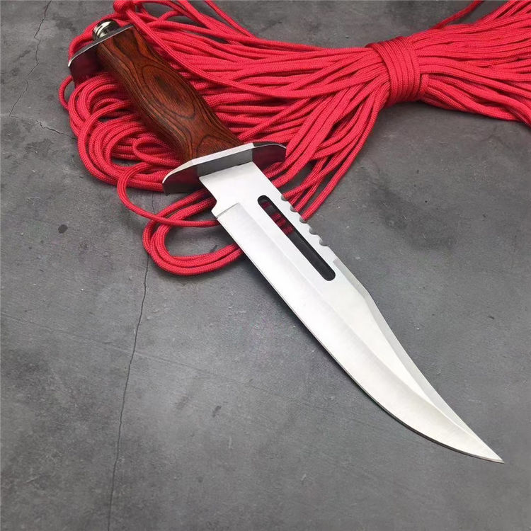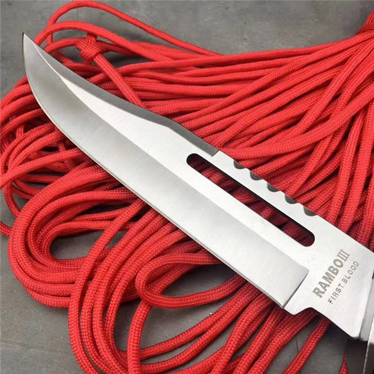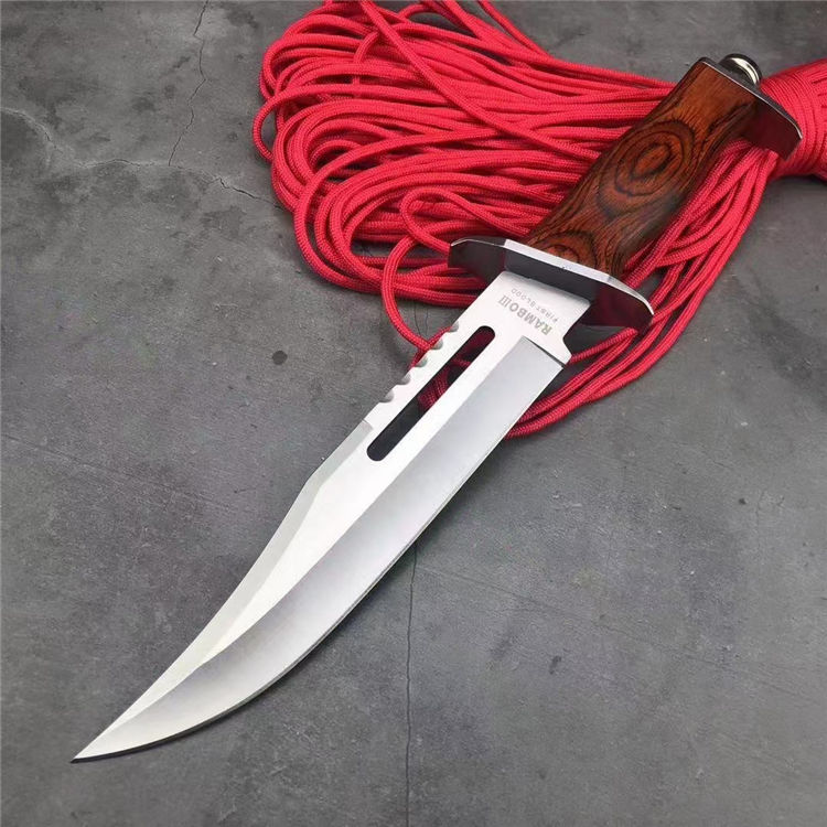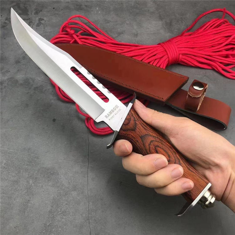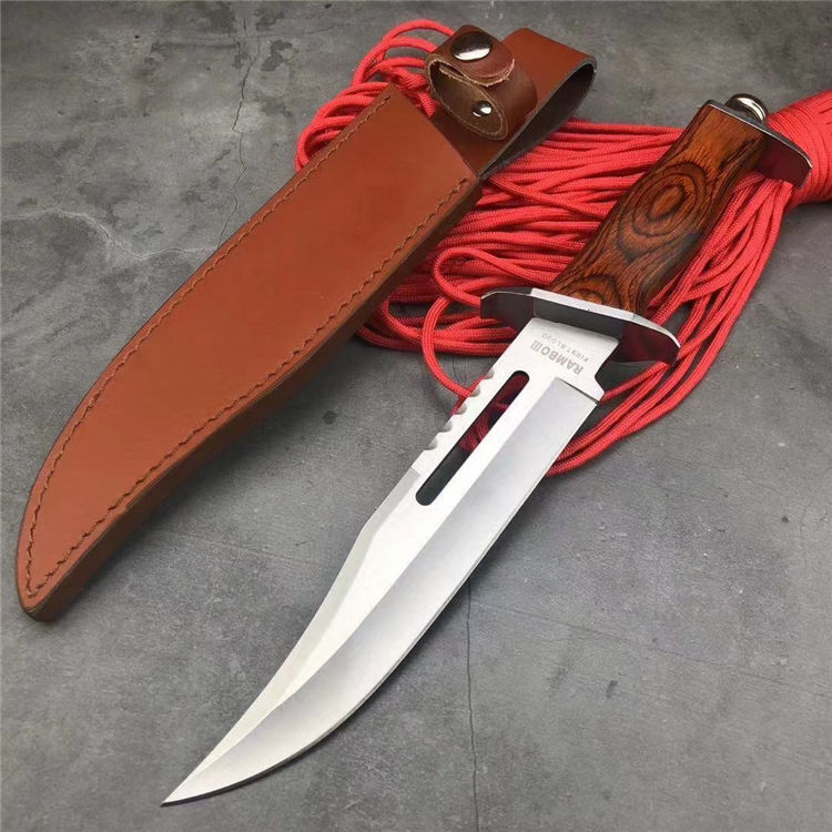 兰博III (小号) 全 长: 32cm 刃 长: 18.5cm 刃 材: 420 硬 度: 56HRC 表 面: 沙光 刃 厚: 4mm 柄 长: 13.5cm 柄 材: 彩木 总重量:420g(含刀套和纸盒) 刀净重:280g 刀柄尾端带有冲击撞针