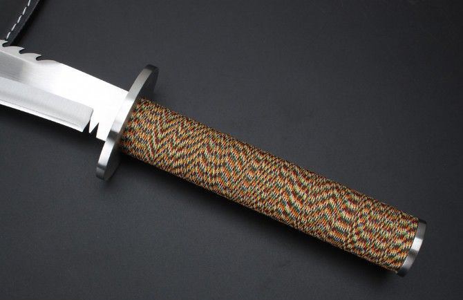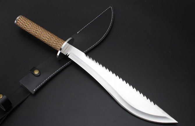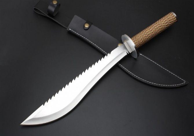 明朝捕头大刀新版 全长:59.0cm 刃长:38.8cm 柄长:20.5cm 刃厚:5.0mm 刃宽:6.2cm(最宽处) 刃材:420 硬度:57HRC 刀重:511克(含包装) 表面:沙光 柄材:钢+檀木+防滑绳 结构:一体龙骨 刀鞘:牛皮套