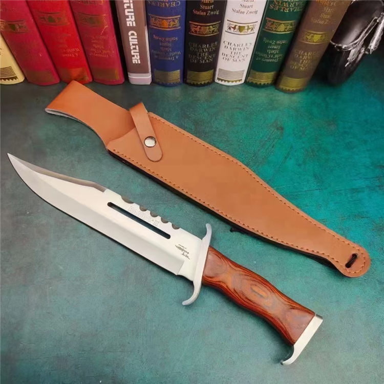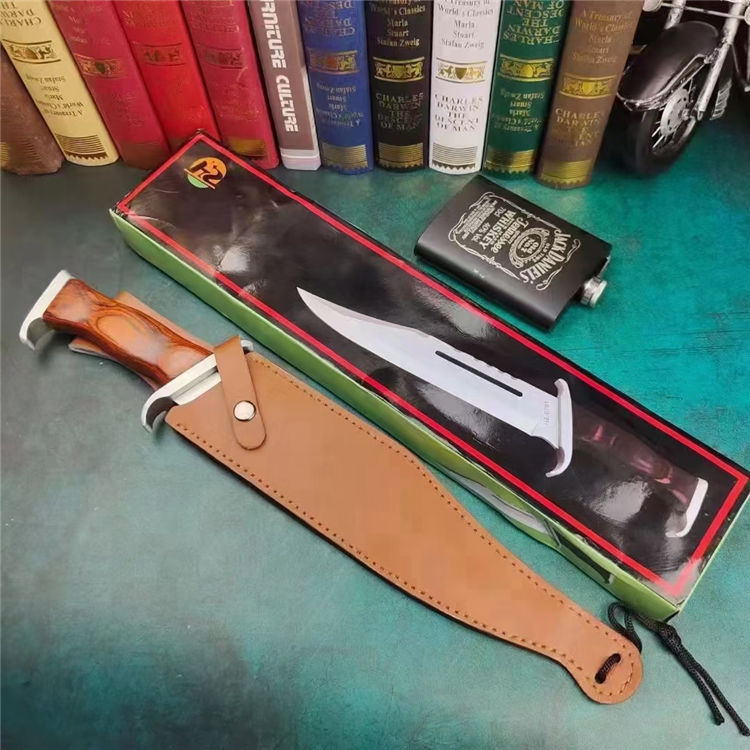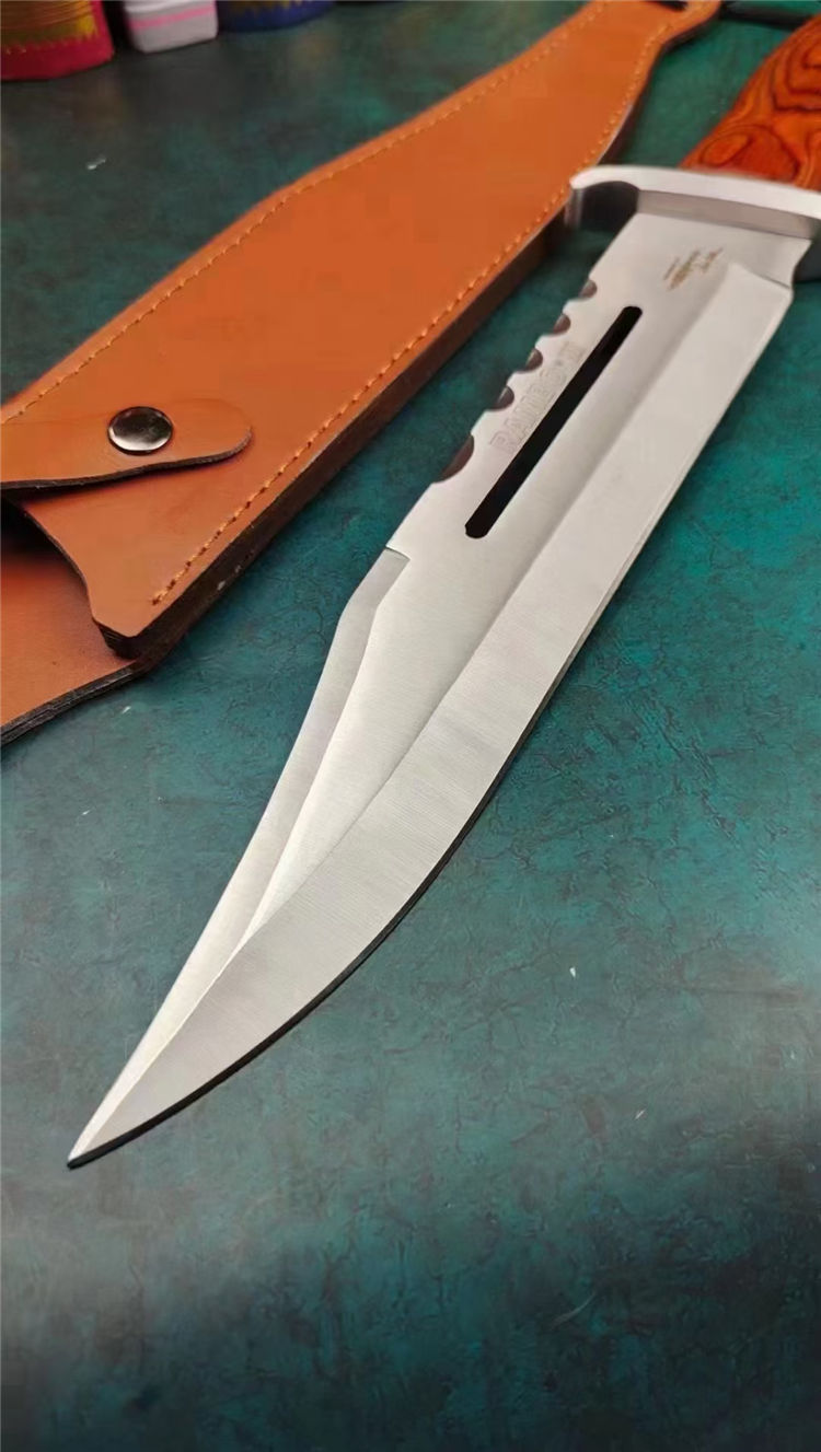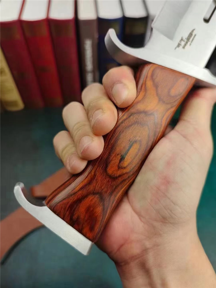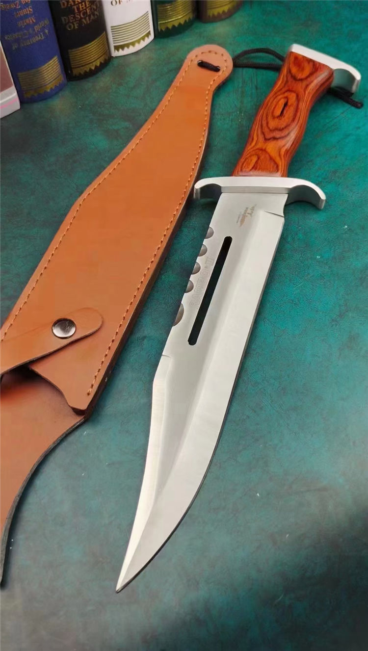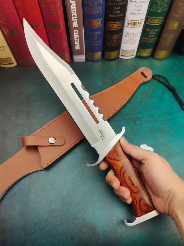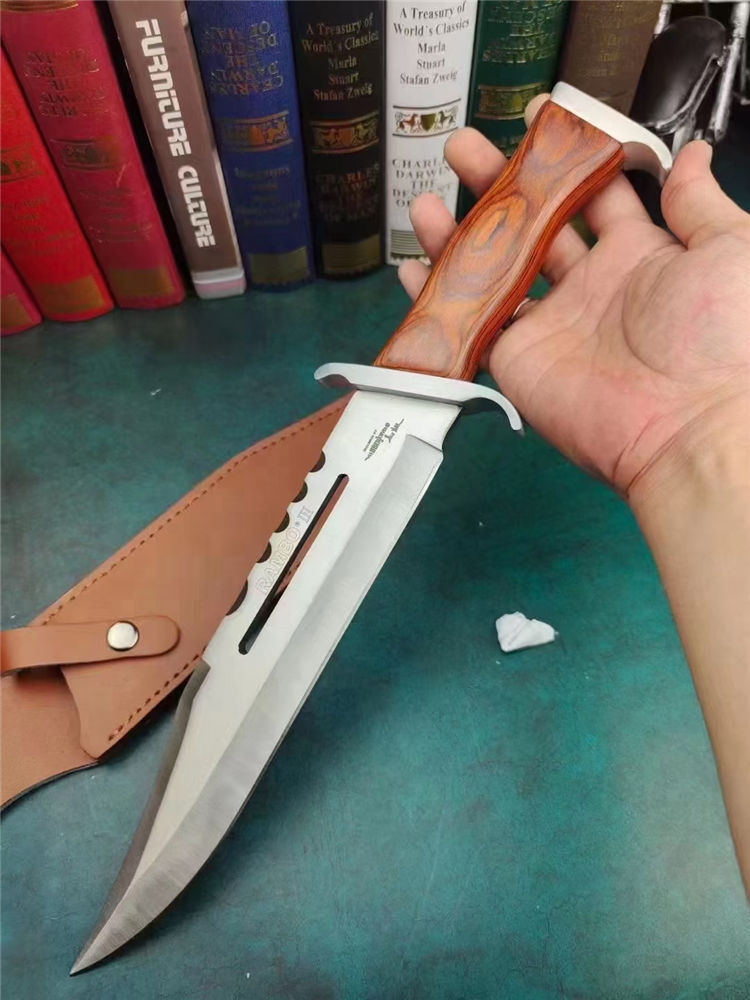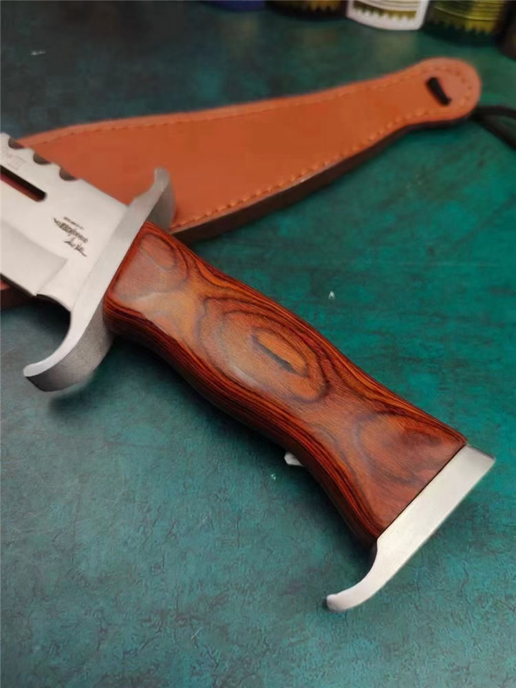 第一滴血之兰博 III (大号) 全 长:42.5cm 刃 长:27.5cm 刃 厚:6mm 刃 材:420J2 柄 材:花梨木 硬 度:57Hrc 表 面:喷砂 刀 套:头层牛皮 净 重:920g