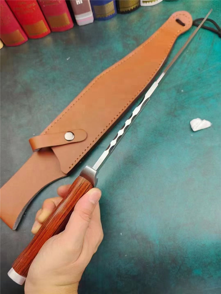 全 长:42.5cm 刃 长:27.5cm 刃 厚:6mm 刃 材:420J2 柄 材:花梨木 硬 度:57Hrc 表 面:喷砂 刀 套:头层牛皮 净 重:920g