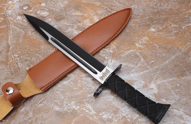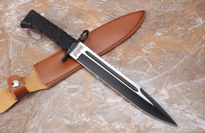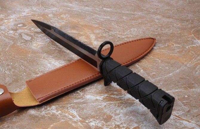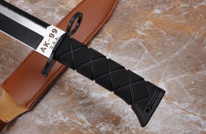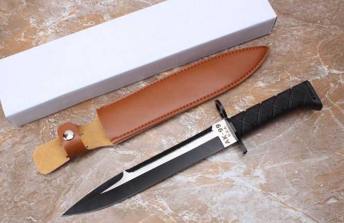 Ak99军刺 全长:43cm 刃长:29cm 柄长:14cm 刃厚:5.8mm 刃材:5CR17 柄材:ABS 硬度:58HRC 净重:390g 毛重:710g 表面:拉丝,发黑 刀套:仿革套
