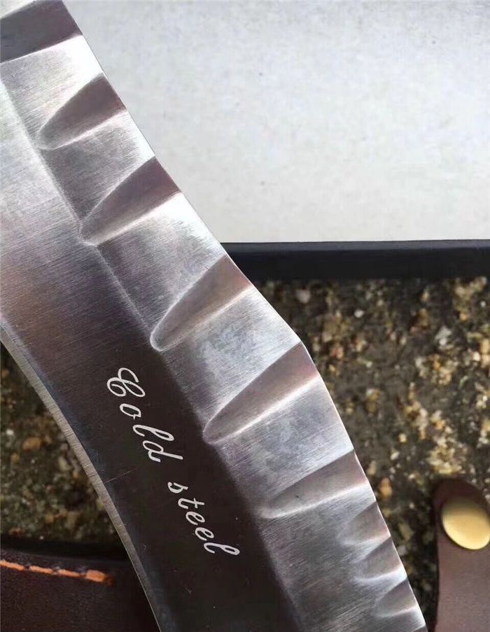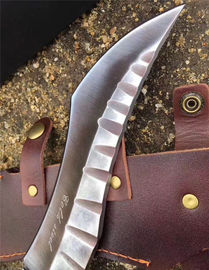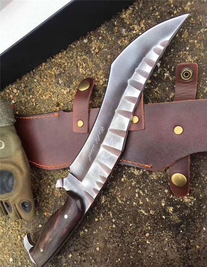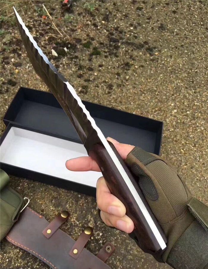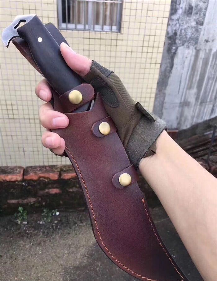 新款鹰龙博击刀 全长:350mm 刃长:225n 刃宽:50mm 厚:6厘 柄长:125mm 钢材:D2 硬度:58/59真空油淬 柄材:黑檀木 重量:800g 一体龙骨 配皮套