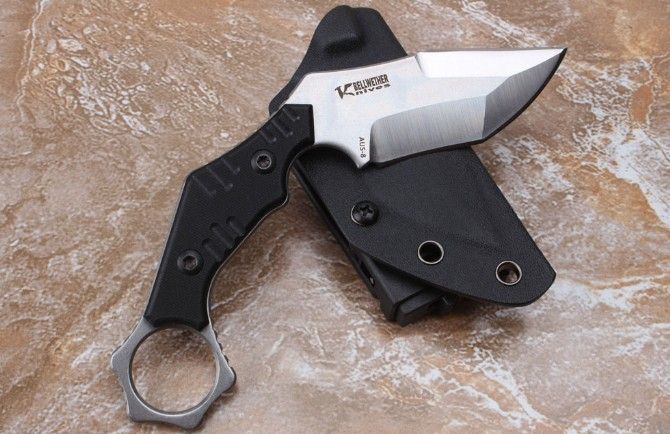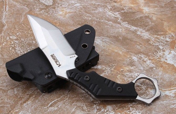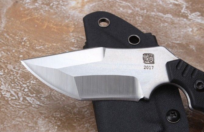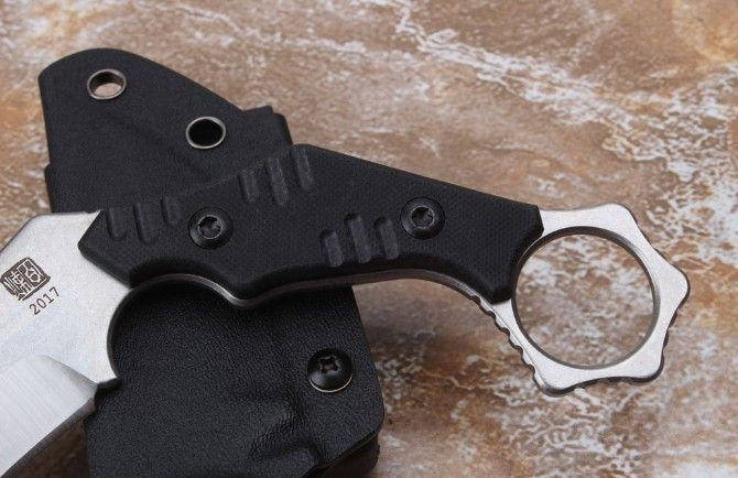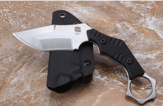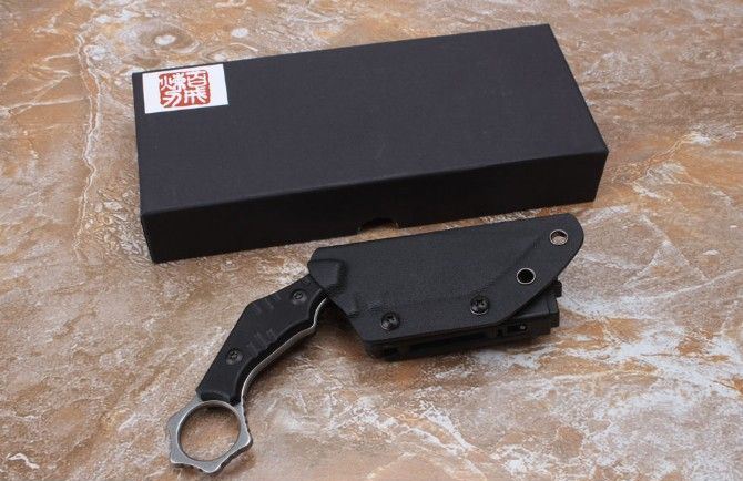 百炼2017狼爪刀 刃材: AUS-8 柄材: 黑G10 全长: 大约21.28厘米 刃长: 6.8厘米 刃厚: 0.35厘米 硬度: 真空热处理58HRC 重量: 321克 表面处理:石洗+沙光 配K鞘礼品盒