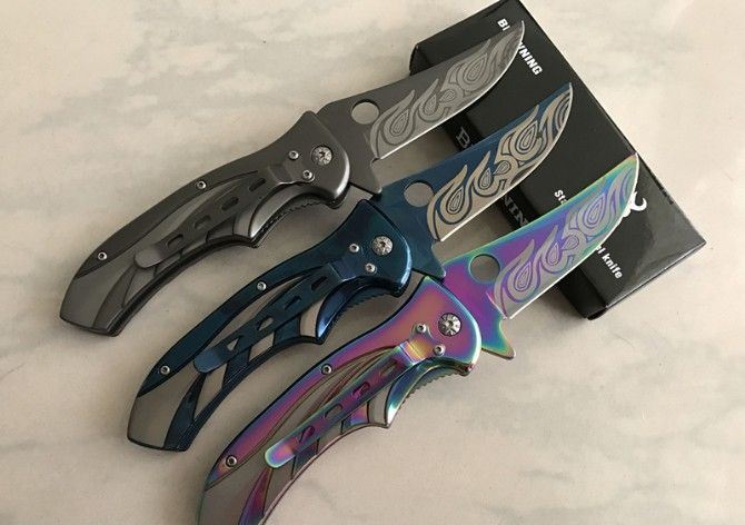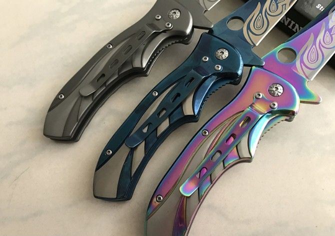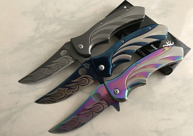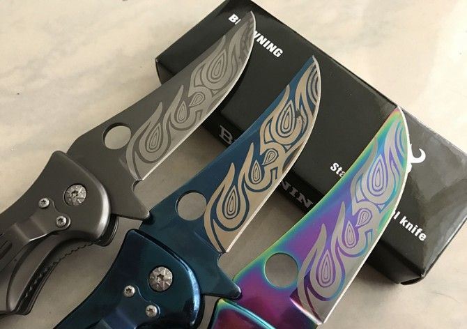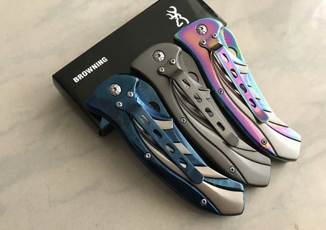 勃朗宁鬼骨火折刀 全 长:21.5cm 刃 长:8.5cm 柄 长:13cm 刃 宽:2.7cm 刃 厚:2.5cm 刃 材:440 重 量:165g(含包装) 硬 度:58HRC 表 面:镀彩 柄 材:全钢扎花 锁 型:侧锁 其 他:彩盒