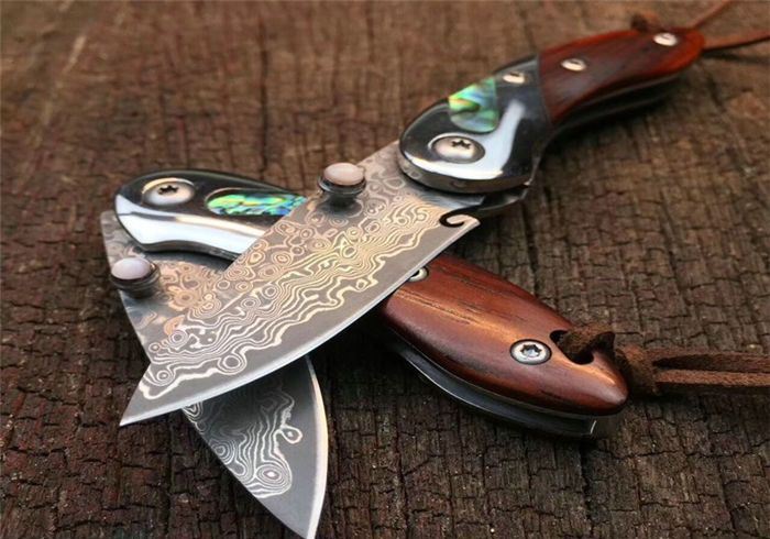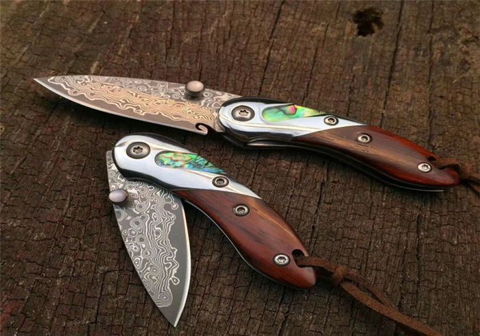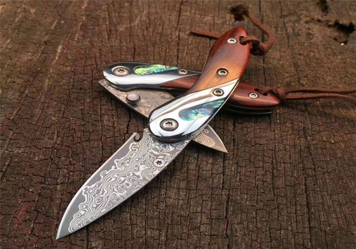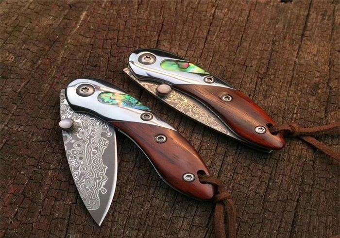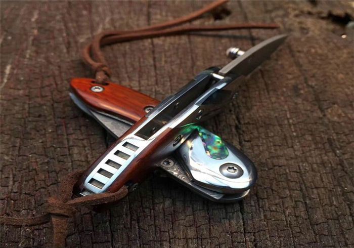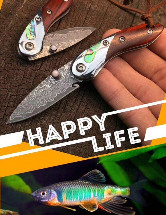 鳍鱲小美鱼大马士革折刀 全长:12cm 刃长:5cm 闭合长:6.6cm 刃钢材:大马士革钢 刃厚:2.1mm 硬度:60HRC 手柄材料:镜面钢头+天然贝壳贝壳+微粒黄檀木