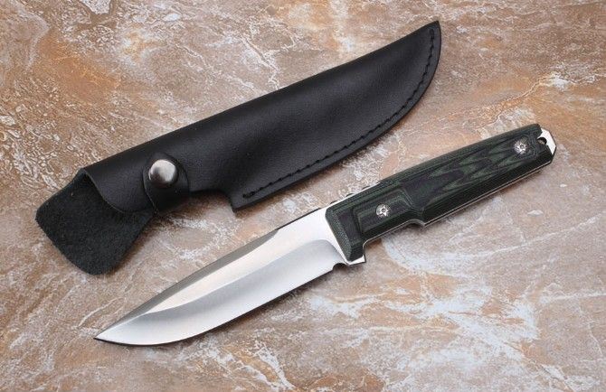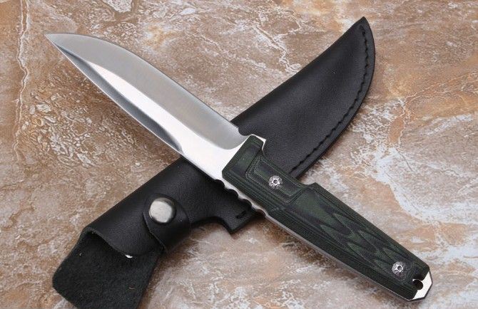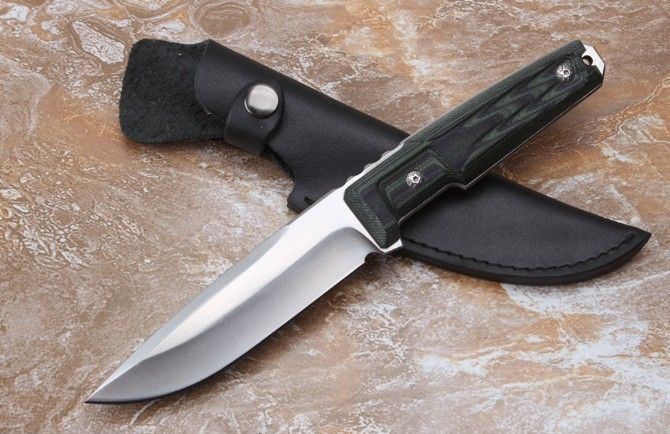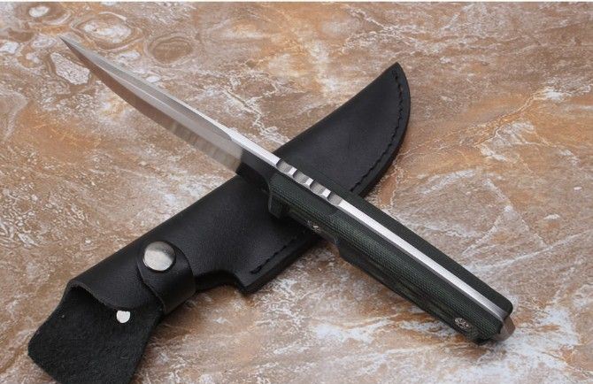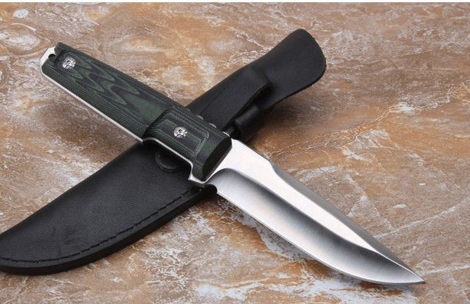 绿典守猎者直刀 全 长:26.2Cm 刃 长:13.1Cm 柄 长:12.7Cm 刃 宽:3.3Cm 刃 厚:5.5mm 刃 材:8CR18Mov 重 量:467克毛重 硬 度:60HRC 表 面:沙光 柄 材:米卡塔 锁 型:定锁 其 他:配硬纸盒+优质牛皮套