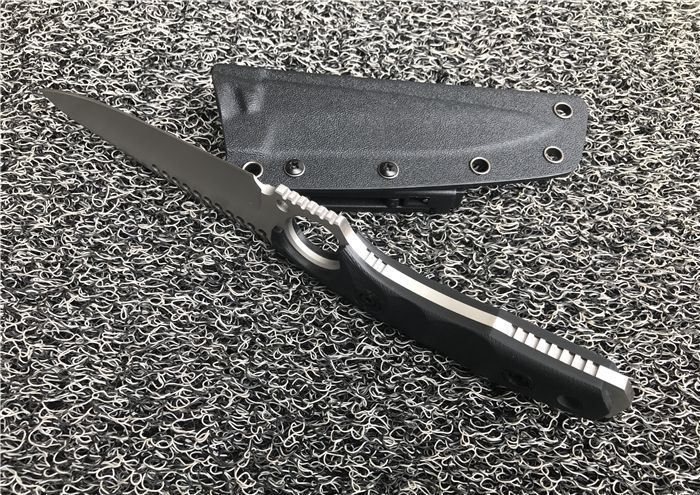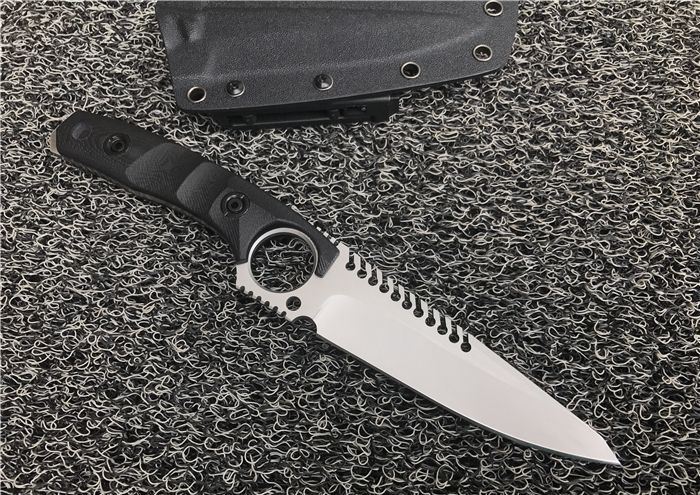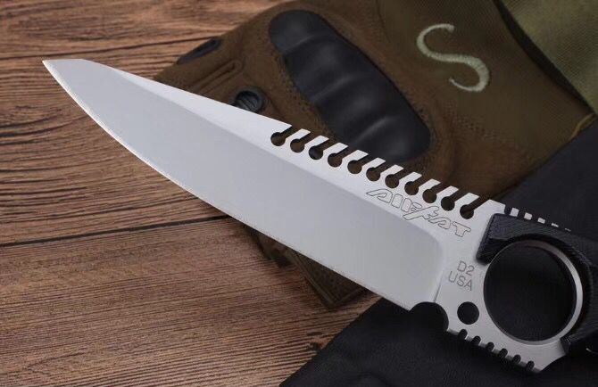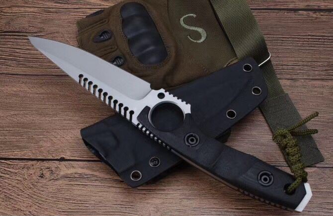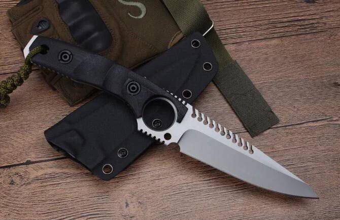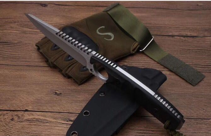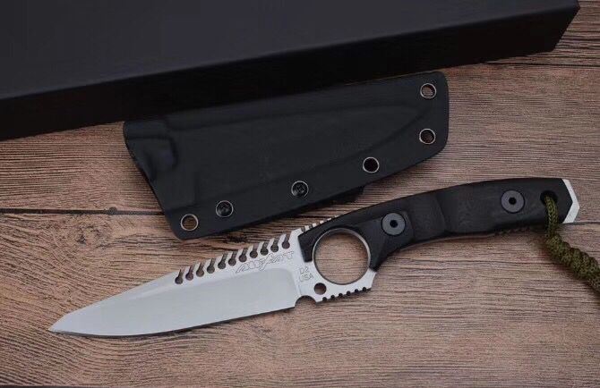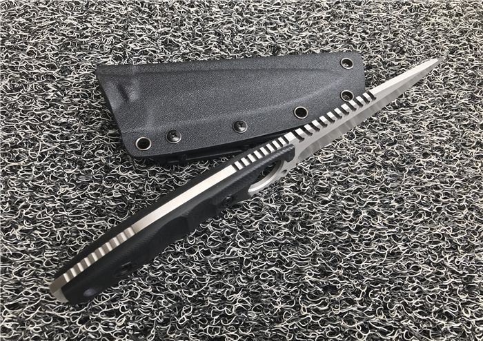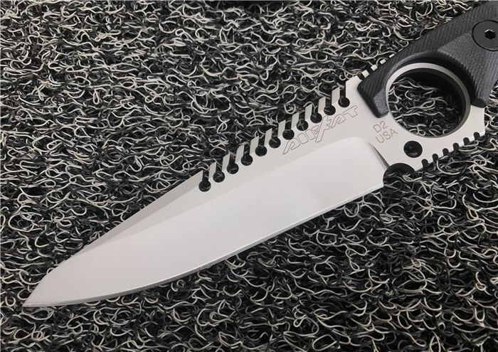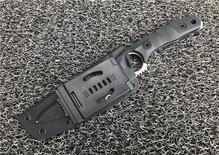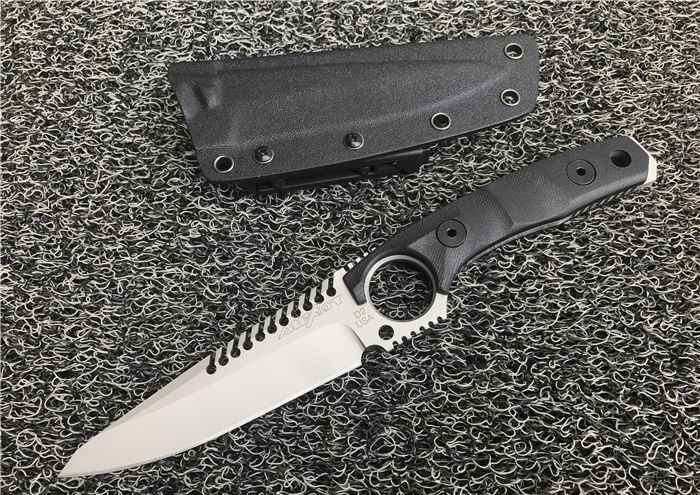 Dwaine Carrillo硬汉军刀地狱鸟直刀 材质:D2 全长:27cm 刃长:12cm 刃厚:0.5cm 刃宽:3.7cm 刀重量:300克 表面:砂光拉丝 硬度:60±1HRC(真空热处理) 手柄:黑色G10,CNC 成型 刀鞘:战术K鞘(进口Kydex板)