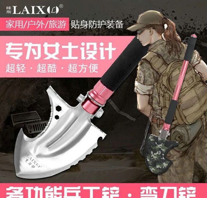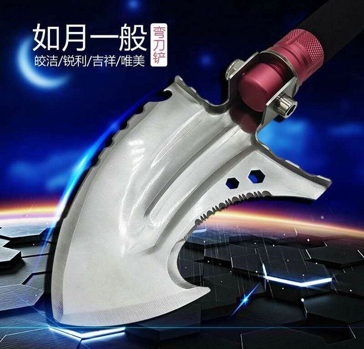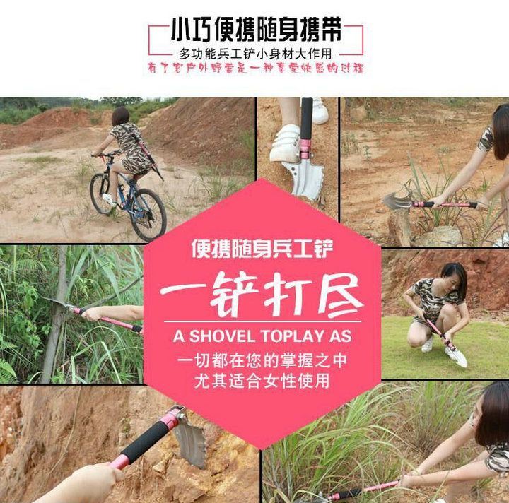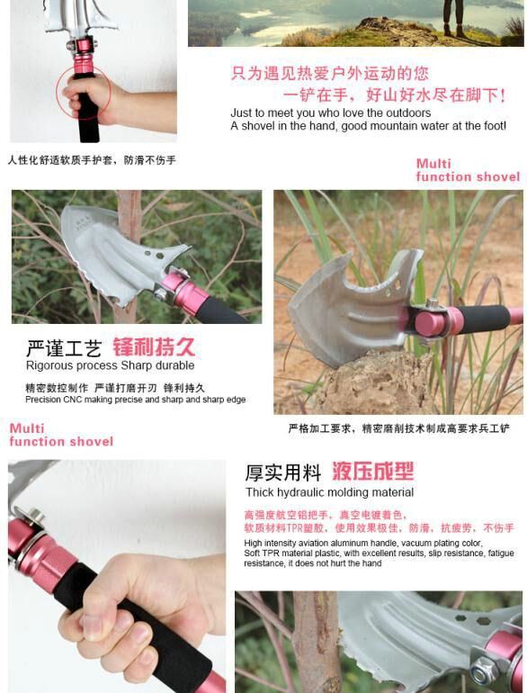 功能:有铲,锄 ,锯,刀,割,开瓶器,打火棒,撞击器,等功能,在生产工艺上采用上好淬火高碳钢,增加强度,抗磨损,抗腐蚀,耐高温等优势.有把铲在手,登山,外出永不怕