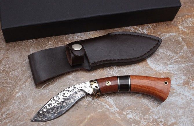 大马士革桑巴狗腿刀 全 长: 20.8cm 刃 长: 9.5cm 刃 宽: 27cm 刃 厚: 3mm 柄 长: 11.5cm 刃 材: 进口大马士革钢 硬 度: 58-60HRC 净 重: 124g 总 重: 288克(含皮套) 表 面: 大马士革花纹 柄 材: 花犁木+钢头 其 他: 牛皮刀套+礼品盒