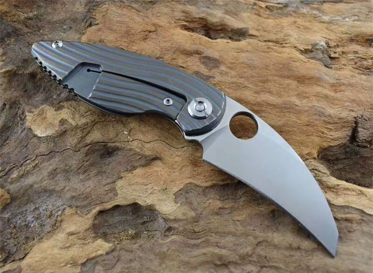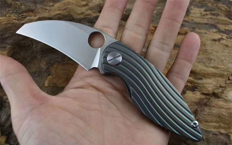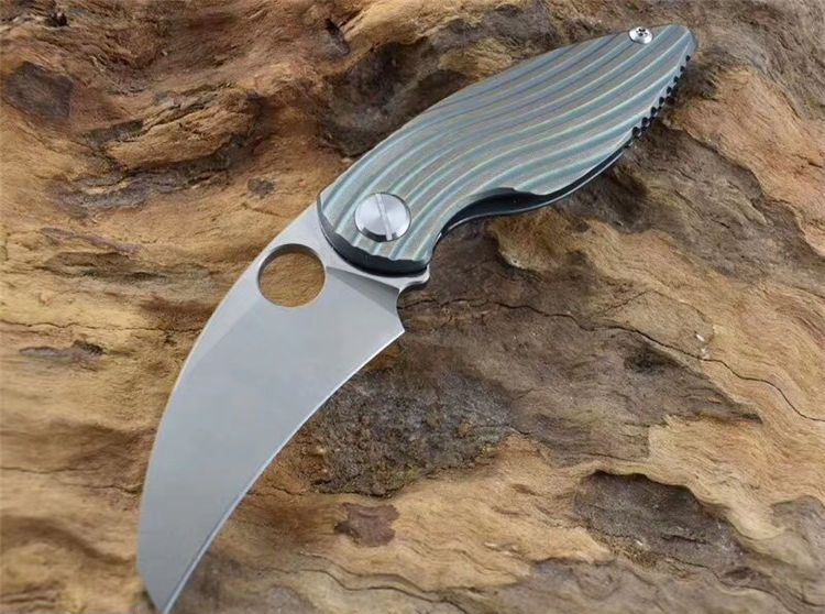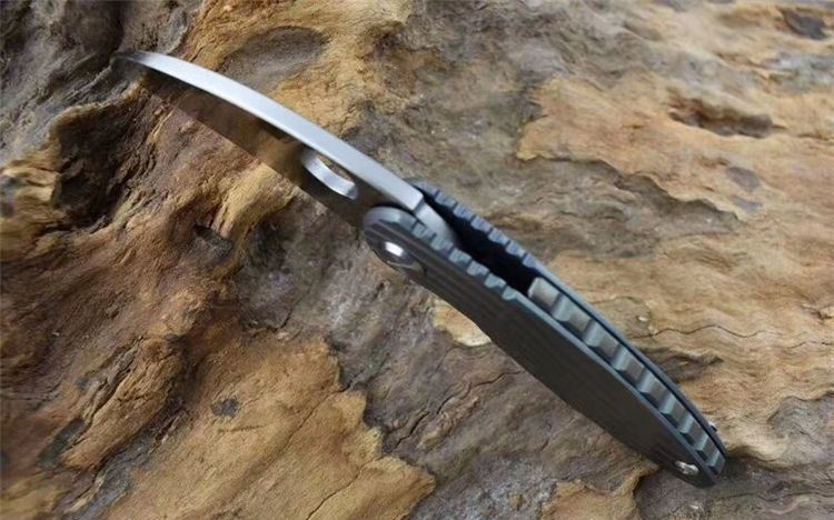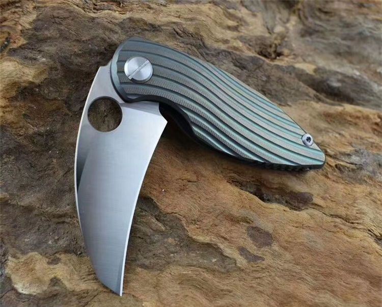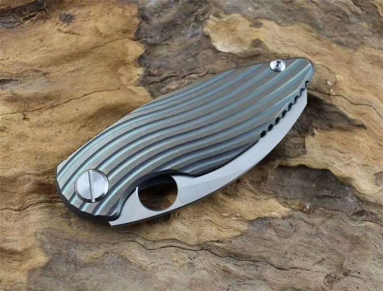 新彩色翠鸟钛柄折刀 全长:150mm 刃长:65mm 柄长:90mm 刃宽:25mm 刃厚:4.8mm 刃材:D2钢 重量:192克 硬度:59-60HRC 表面:沙光 处理材料:TC4钛合金+带轴承滚珠