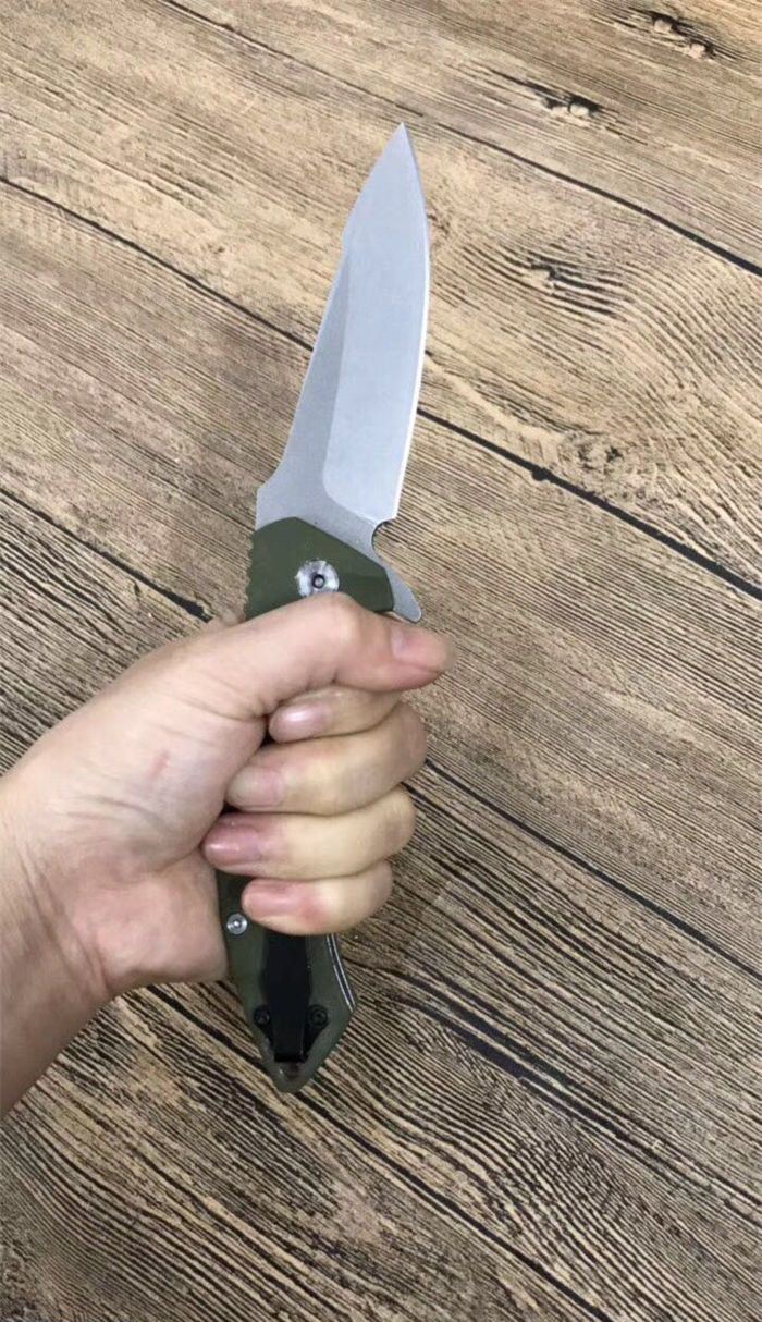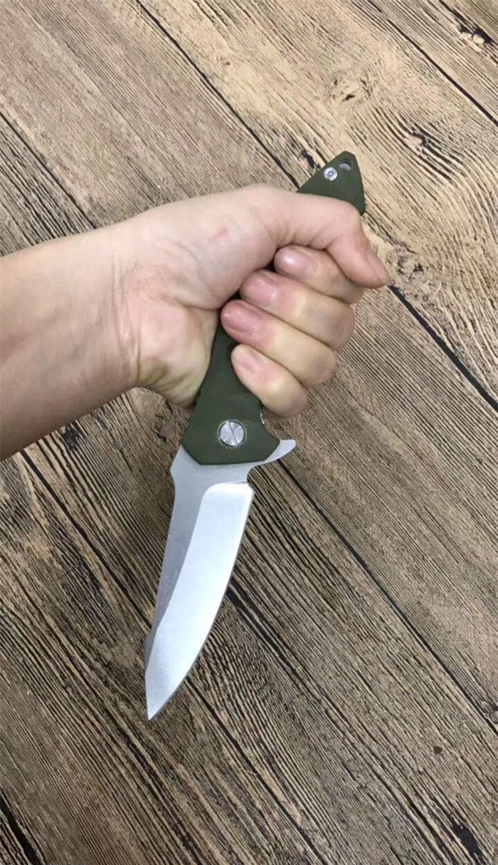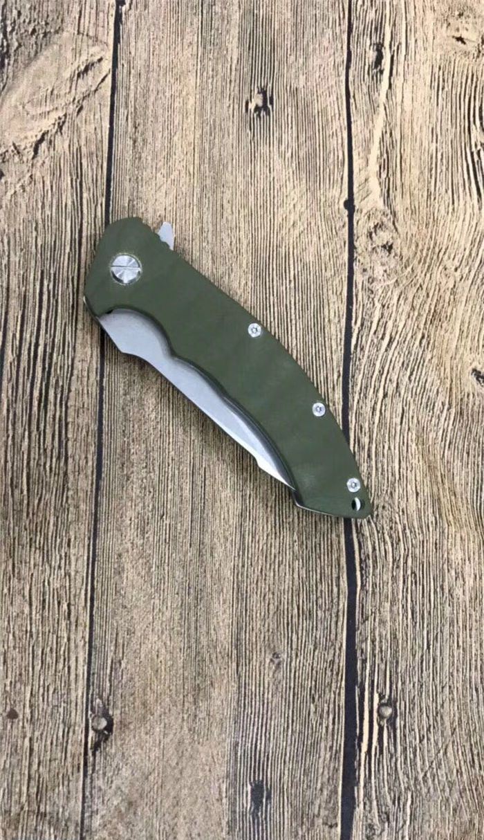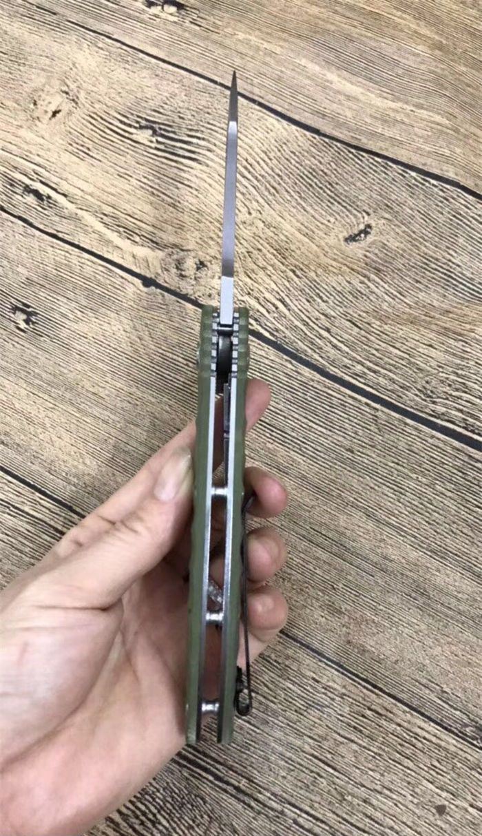 快开V8折刀 全 长:201mm 刃 长:89mm 柄 长:117mm 刃 宽:2.7m 刃 厚:0.3mm 刃 材:7Cr13Mov 重 量:121g(含包装) 硬 度:56HRC 表 面:石洗 柄 材:G10鱼片纹 锁 型 背锁
