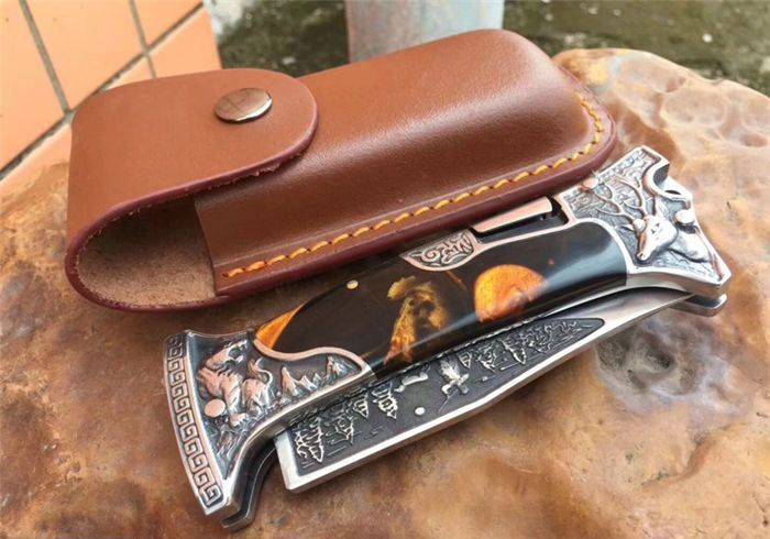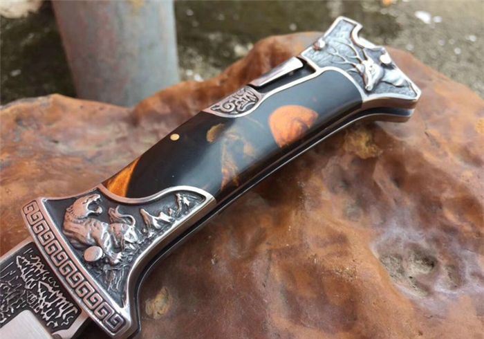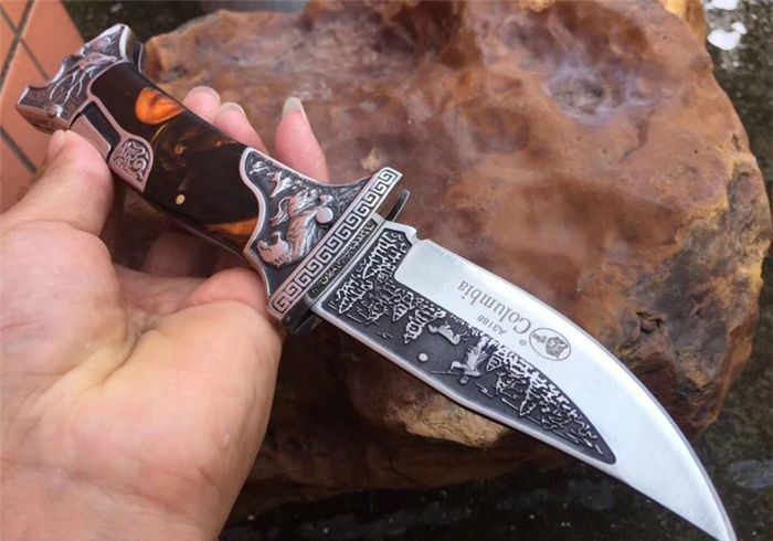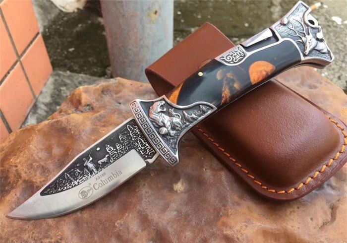 哥伦比亚A3188战术折刀橡木柄 全 长:22.7cm 刃 长:10cm 柄 长:12.7cm 刃 宽:3.5cm 刃 厚:3cm 刃 材:7Cr13Mov 重 量:300g(含包装) 硬 度:58HRC 表 面:雕刻 柄 材:双钢头雕刻+进口象木 锁 型:背锁 包 装:纸盒+真皮套 备 注:带腰夹