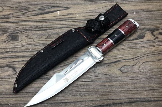 哥伦比亚A16战术直刀 全 长:30cm 刃 长:18cm 刃 宽:4cm(最宽处) 刃 厚:4CM 柄 长:12.5cm 柄 厚:2.3CM 刃 材:3CR13 硬 度:57HRC 柄 材:酸枝木 重 量:480克(含包装) 包 装:尼龙套