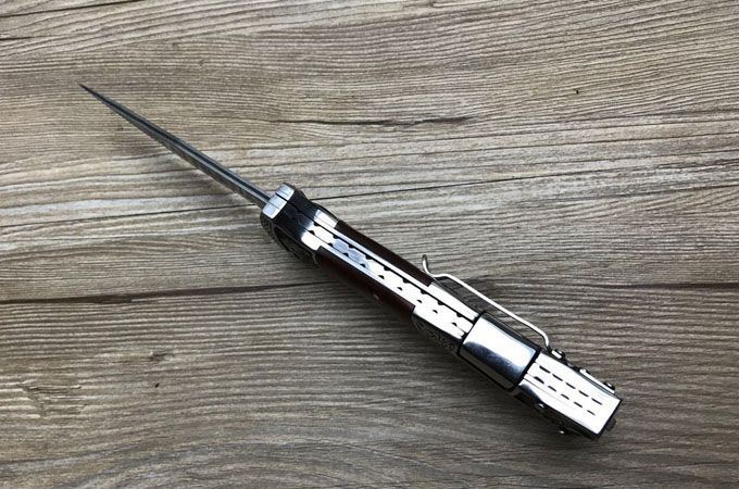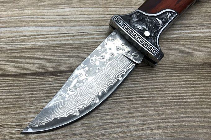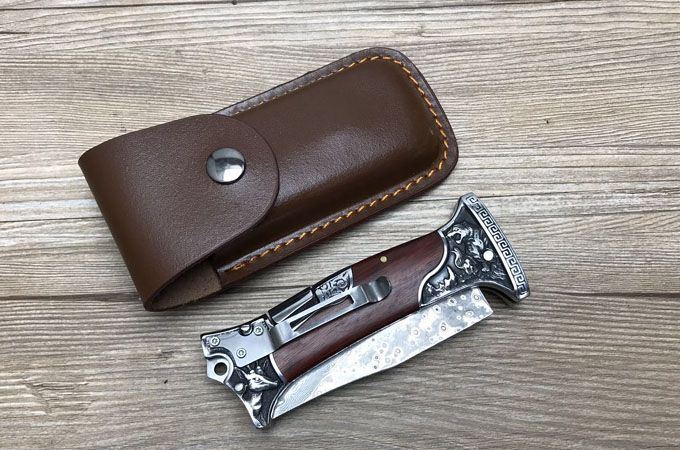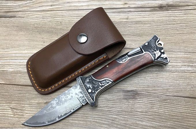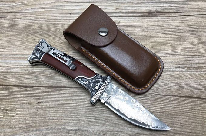 哥伦比亚大马士革战术折刀 全 长:22.7cm 刃 长:10cm 柄 长:12.7cm 刃 宽:3.5cm 刃 厚:3cm 刃 材:大马士革 重 量:300g(含包装) 硬 度:58HRC 表 面:雕刻 柄 材:双钢头雕刻+进口象木 锁 型:背锁 包 装:纸盒+真皮套 备 注:带腰夹