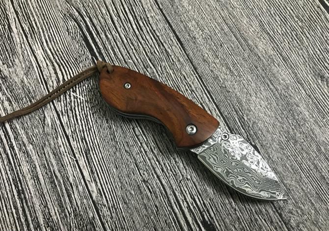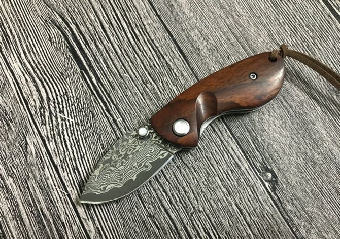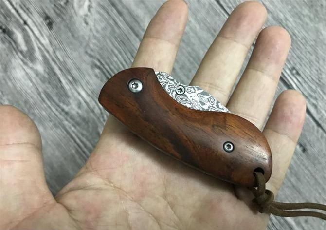 小红鱼大马革士折刀 全长:11.8cm 刃长:4.6cm 刃宽:2.5cm(最宽处) 柄长:7m 硬度:60HRC 刃厚:0.25cm 重量:约100克 表面:大马士革花纹清晰 刃材:大马士革钢材 柄材:科檀木 包装:礼品盒
