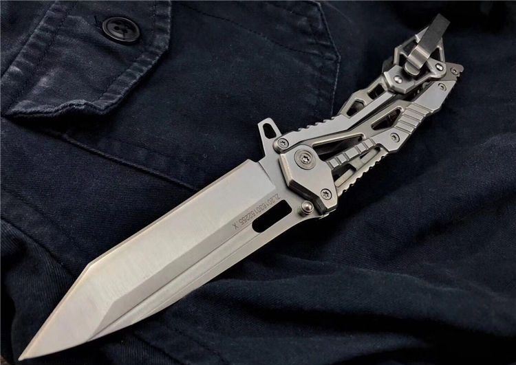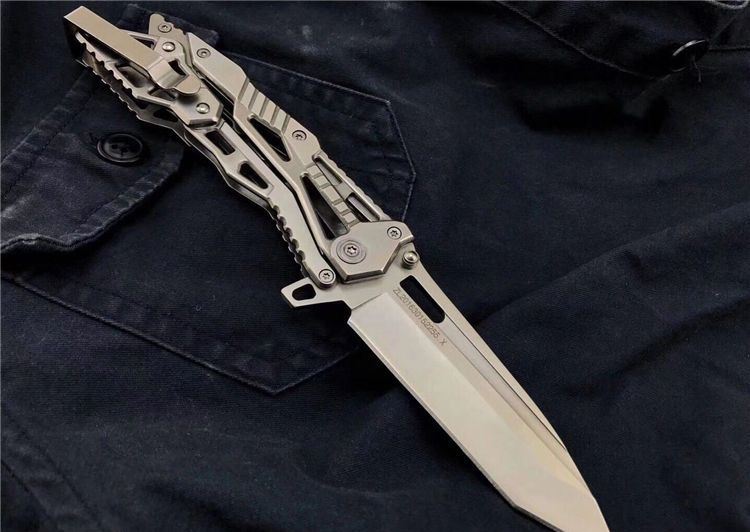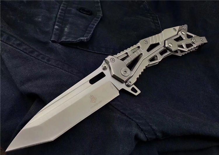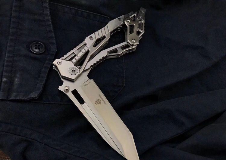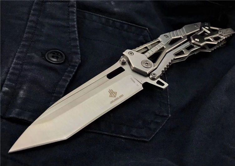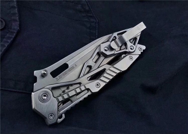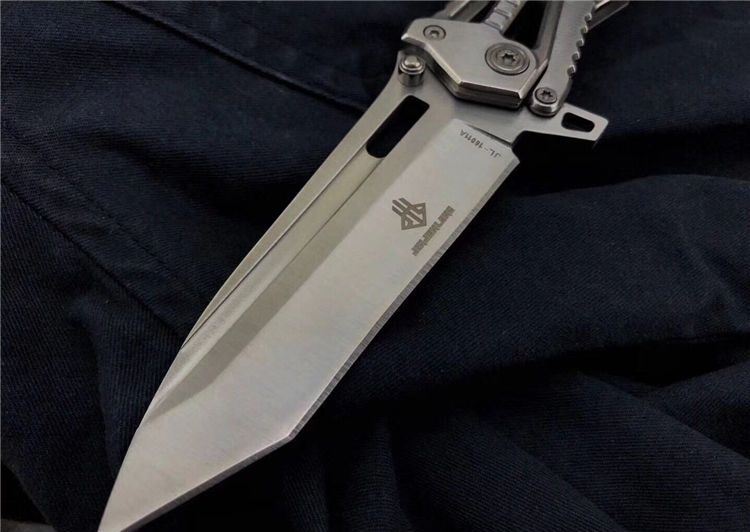 JL16011新款机械全钢柄折刀 全长:19.5 刃长:7.8 刃厚:0.25 刃宽:2.5 柄材:全钢 刃材:440高级不锈钢 硬度:56-57 重量:80克 锁定:机械锁 刃口:锋利 表面处理:拉丝 带背夹,原厂纸盒。 独特的造型,创新的操作方式,打破传统构思,令人焕然一新!开刀:刀柄尾端的三角部分可以象活动夹子一样,用手指稍用力一夹,即可将刀刃打开