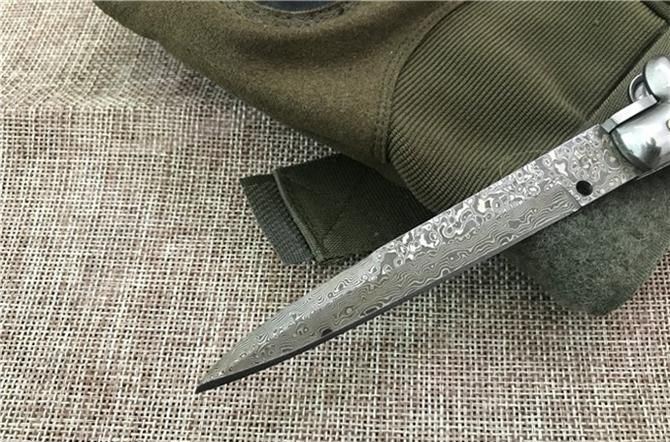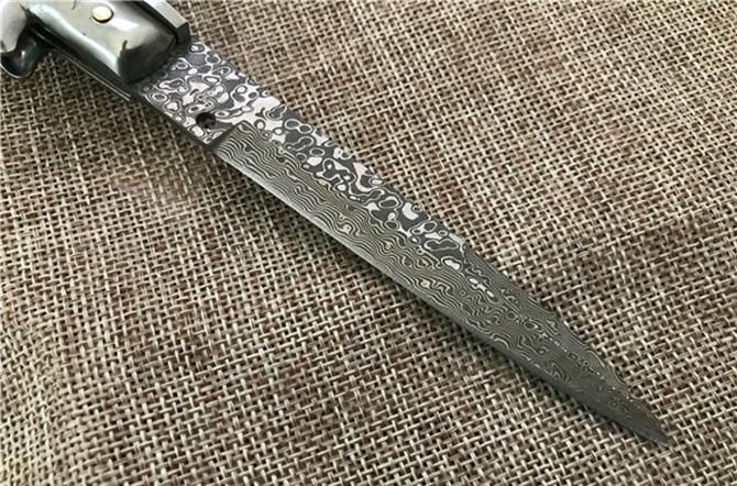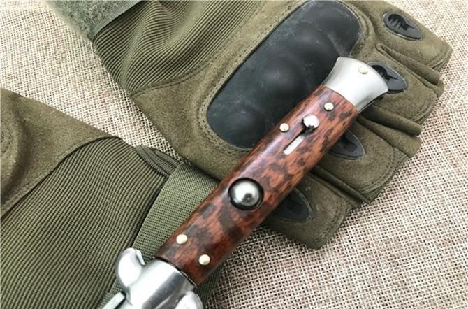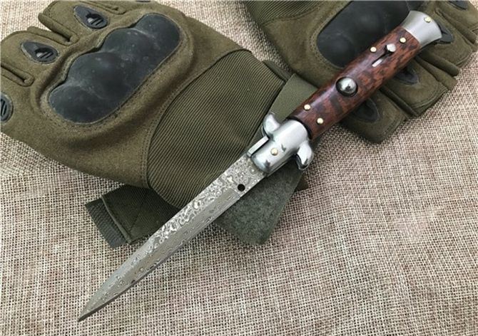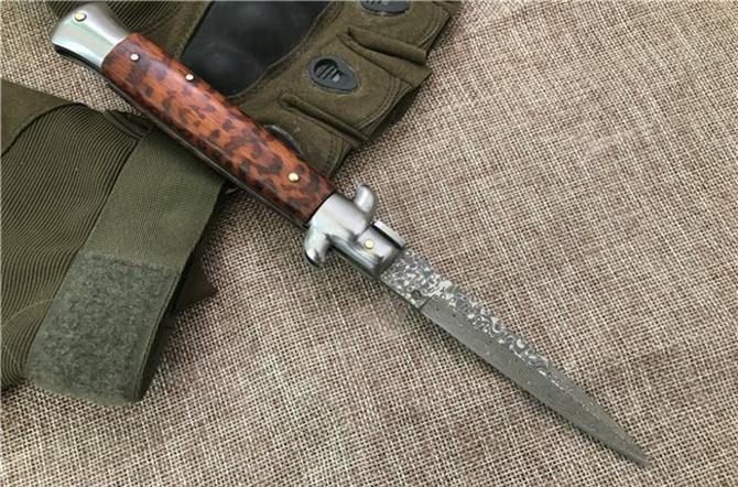 大马士革9英寸AKC黑手党蛇纹木跳刀 全 长:21.9CM 刃 长:9.2CM 柄 长:123MM 刃 厚:3.0mm 刃 材:大马士革 刀 柄:蛇纹木 开刀方式:弹簧 重 量:150克