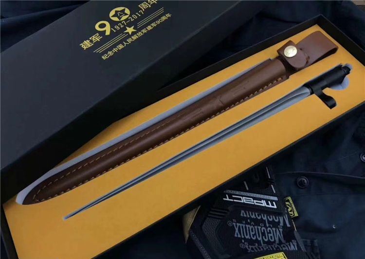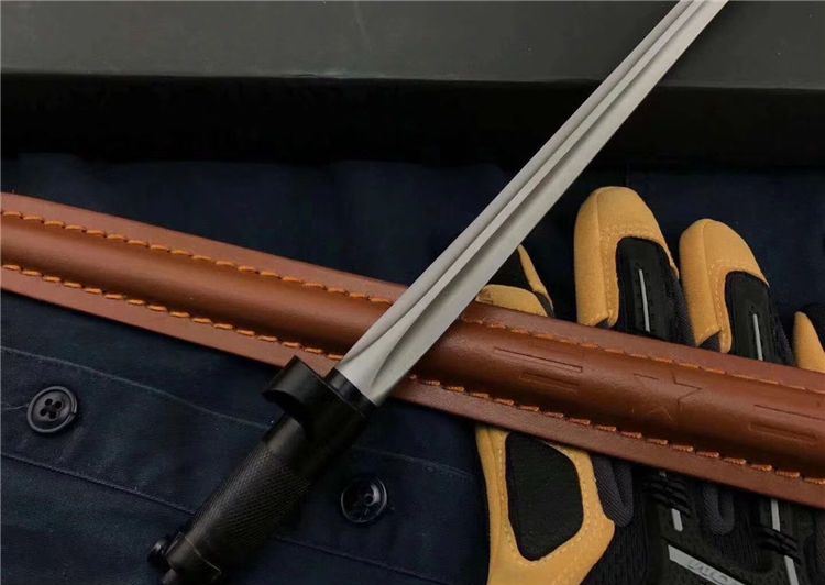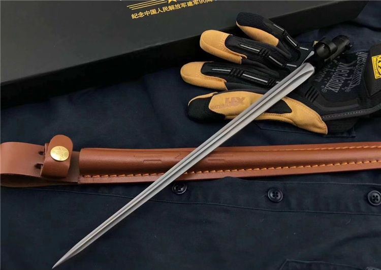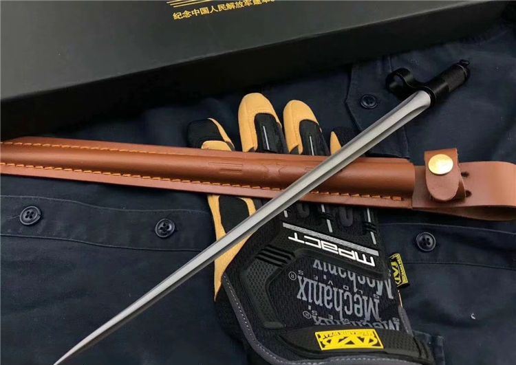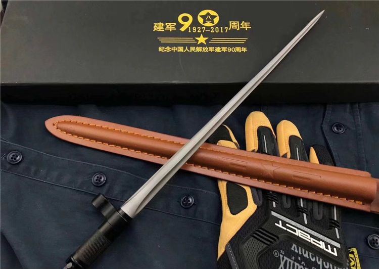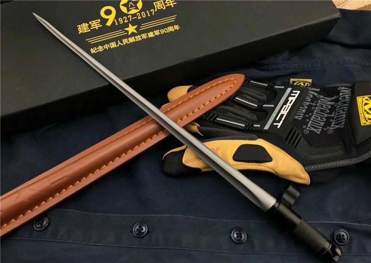 90周年尖头56式三棱刺刀 全长:38cm 刃长:32cm 刃厚:1.8cm 刃宽:1.8cm 刃厚:1.8cm 刃宽:1.8cm材质 合金钢刀鞘:真皮