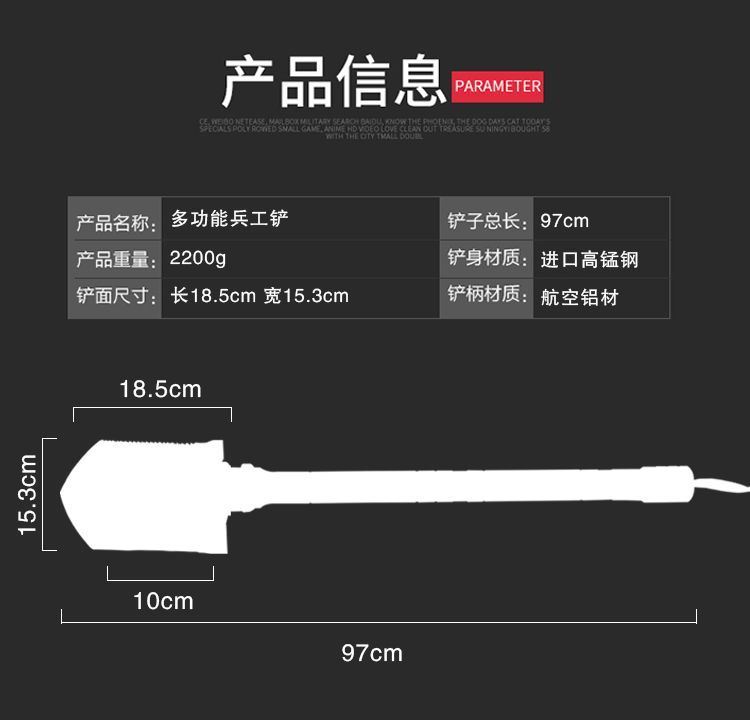 自由狼户外兵工铲 铲子总长:97cm 产品重量:2200g 铲身材质:进口高锰钢 铲面尺寸:长18.5cm 宽15.3cm 铲柄材质:航空铝材