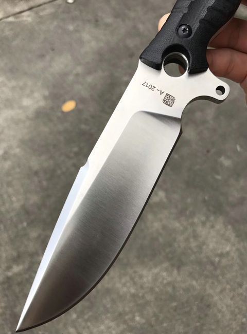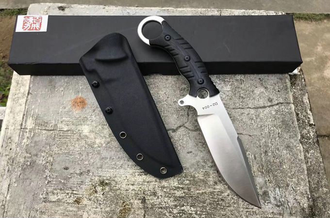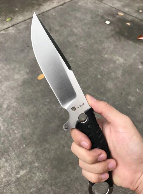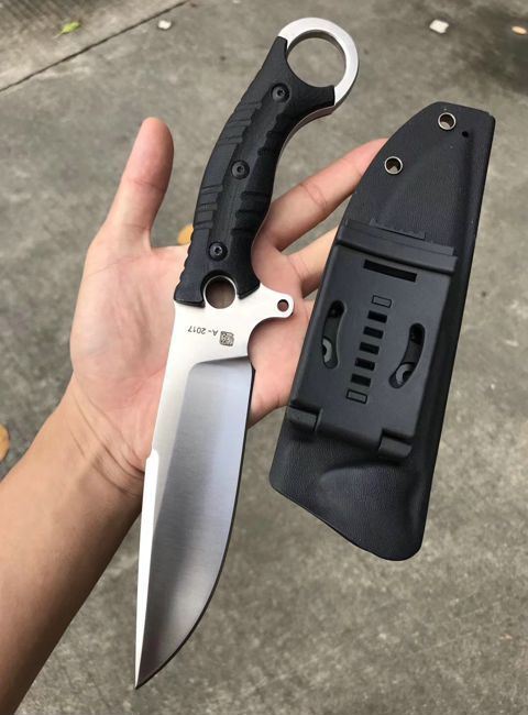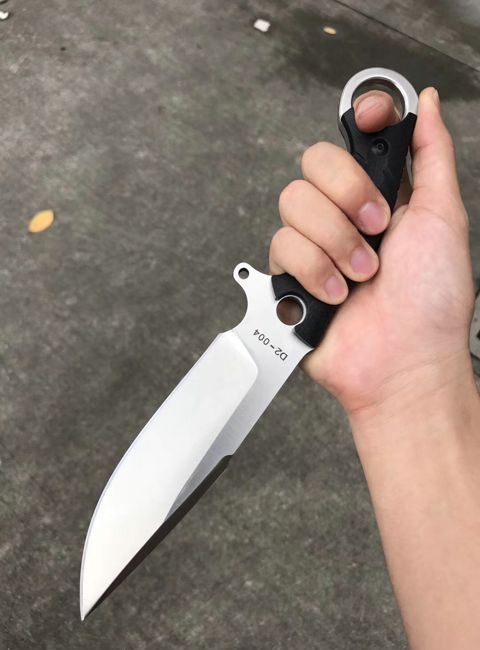 百炼惊天者直刀 总长:28.5cm 开刃长:13.5cm 刃厚:6MM 刃宽:4cm 钢材:D2钢 硬度:59-60HRC,真空热处理 柄材:黑色G10,表面处理,灰黑石洗与砂光效果 套:战术K鞘,皮带夹子