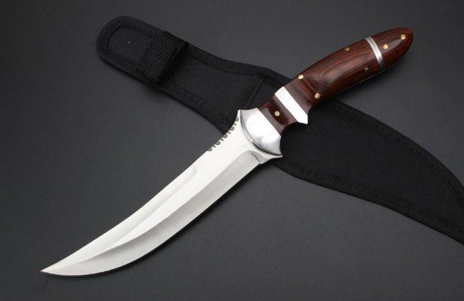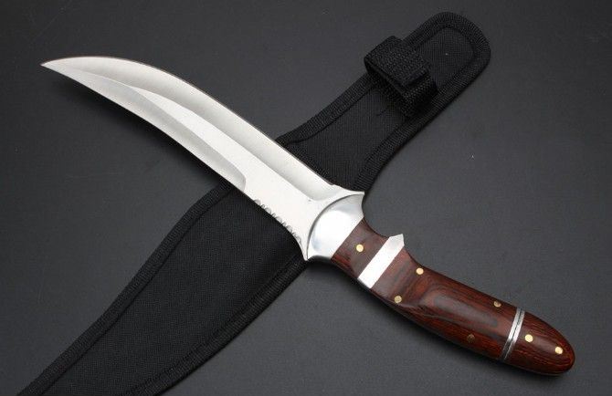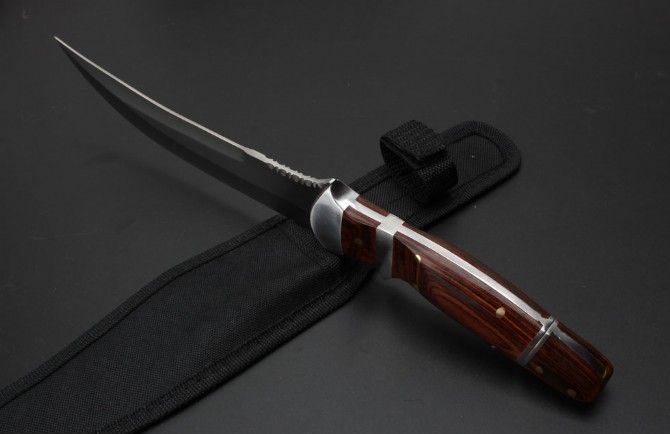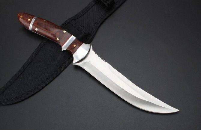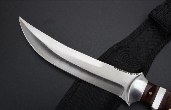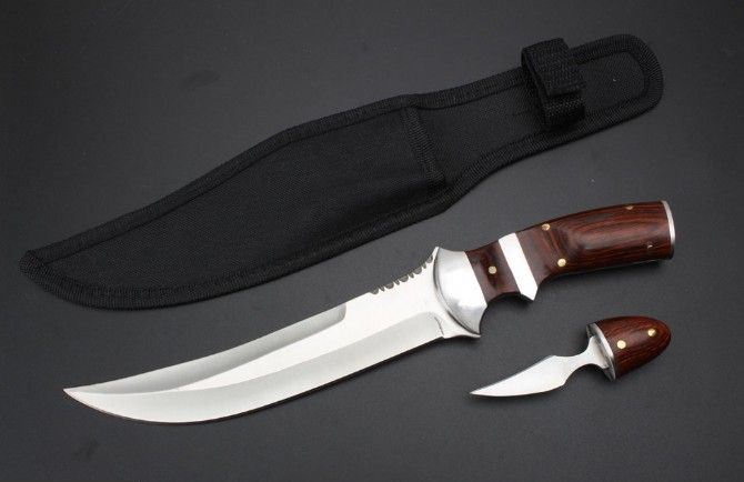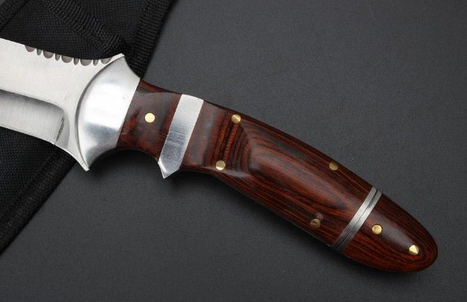 手刺版战术直刀 全长:32.9cm 刃长:18.5cm 刃厚:0.42mm 刃宽:3.5cm 柄长:14.8cm 刃材:5Cr13Mo 刀重:342克 总重:382克 表面:精细沙光 柄材:钢头+彩木 手柄后面拉开是小手刺刀 硬度:57CHR 刀鞘:尼龙套