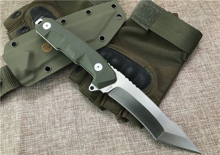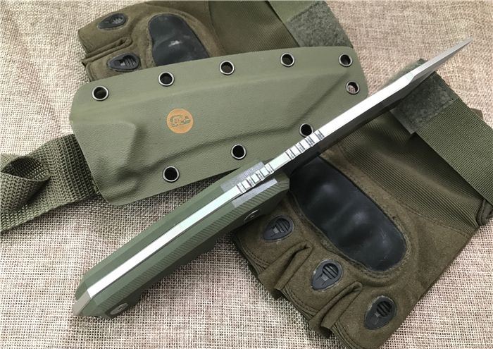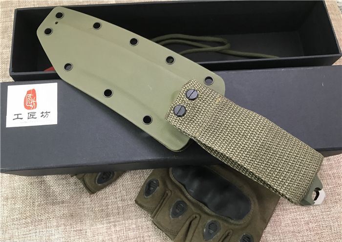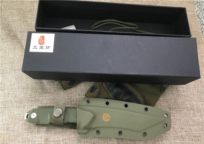 工匠坊DC53钢前卫直刀 全长:260mm(龙骨一体) 刃长:135mm 刃厚:6mm 柄长:125mm 刀刃最宽处:39mm 表面:数控磨细砂光处理,平面纯手工幼拉丝,超强立体感刃线 类型:以锋利度,韧性保持度最出色 开刃方式:二次开刃 刃材:DC53(线切割开料) 热处理方式:真空淬油热处理 硬度:60_62HRC 柄材:美国进口军绿色G10手柄+螺丝钢钉 包装:精美黑礼盒+护刀油+伞绳 毛重:469克(含包装)净重325克 刀鞘:美国进口军绿色k鞘+带扣