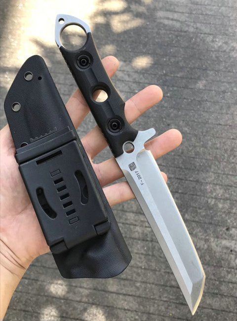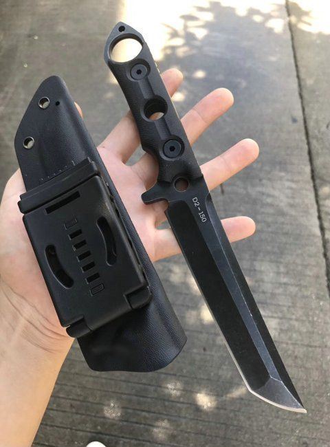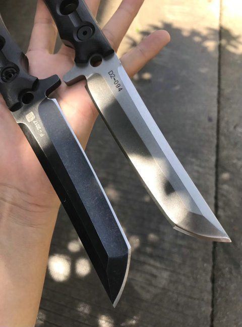百炼锋芒武士直刀 总长:26.5cm 刃长:13cm 刃厚:6MM 刃宽:3cm 钢材:D2钢 硬度:6HRC真空热处理 表面处理:灰黑石洗,钢本色石洗 柄材:黑色G10 刀套:进口K鞘套
