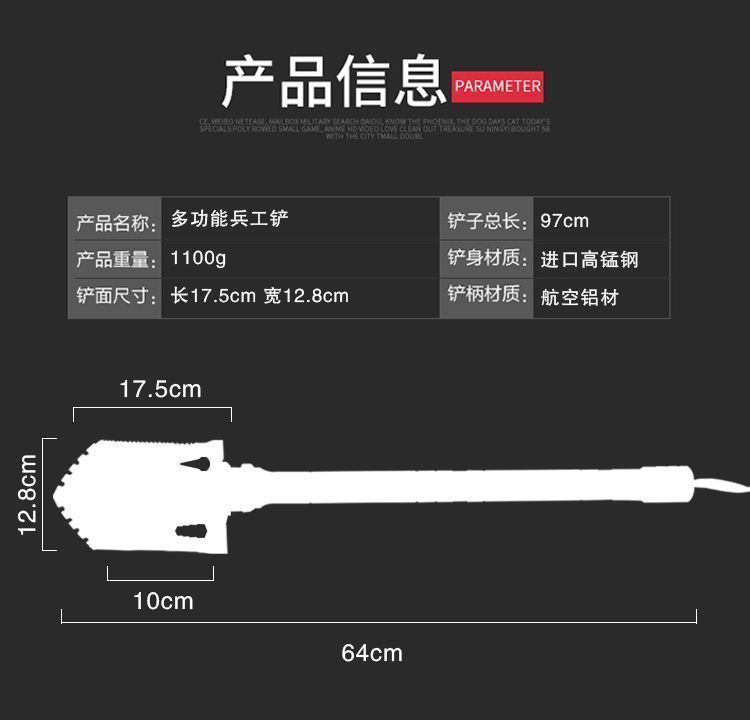 自由狼轻便型龙爪铲 铲子总长:97cm 产品重量:1100g 铲身材质:进口高锰钢 铲面尺寸:长17.5cm,宽12.8cm 铲柄材质:航空铝材
