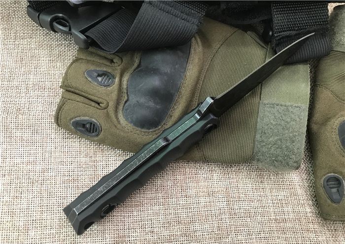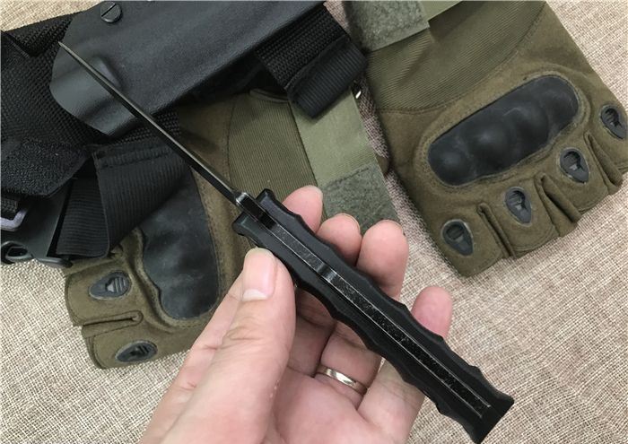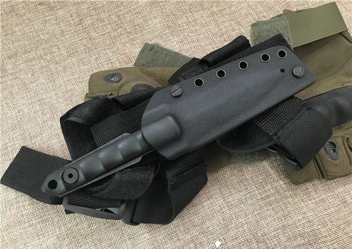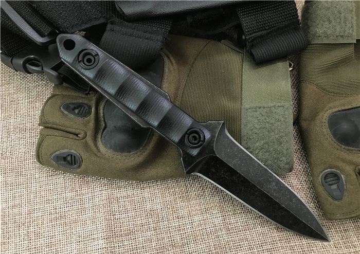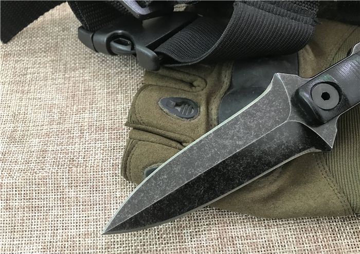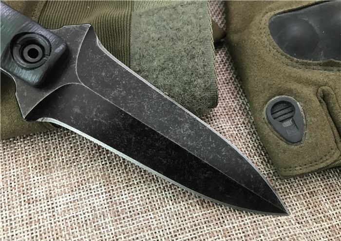 特种兵格斗双刃刀(进口D2钢) 全长:200MM 刃长:95MM 刃宽:13MM 刃厚:4.1MM 刃面打磨:数控V磨 刃面处理:沧桑石洗 热 处 理:真空油淬热处理 硬度:60-61HRC 材料: D2(100%可测试) 柄材:黑色G10 刀鞘:进口K鞘 刀重:约155G 刀鞘重:约116G