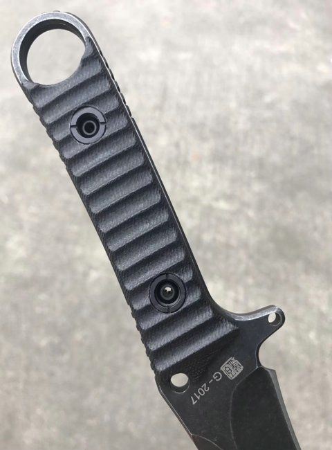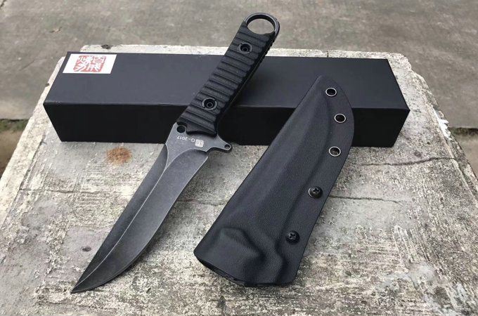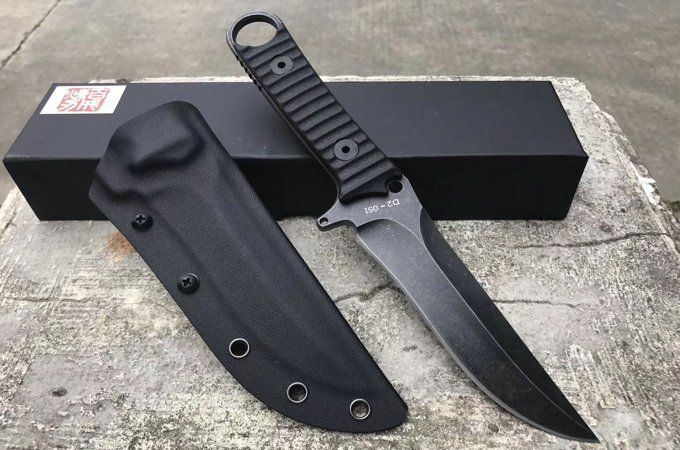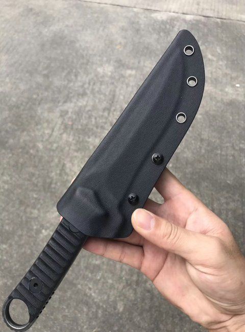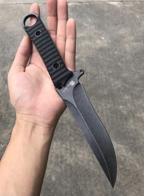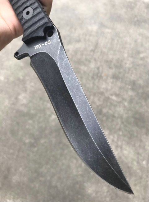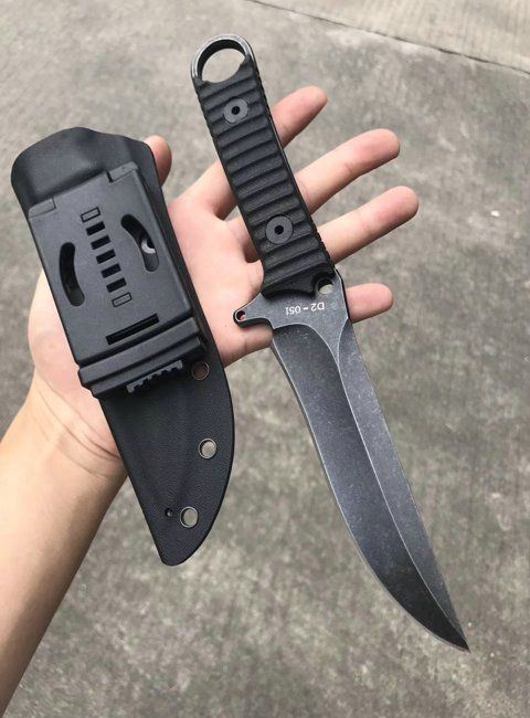 百炼新款G-STRONG直刀 总长:27cm 刃长:13cm 刃厚:6MM 刃宽:3cm 钢材:D2钢 硬度:6HRC真空热处理 表面处理:灰黑石洗 柄材:黑色G10 刀套:进口K鞘套 包装:黑色礼盒包装