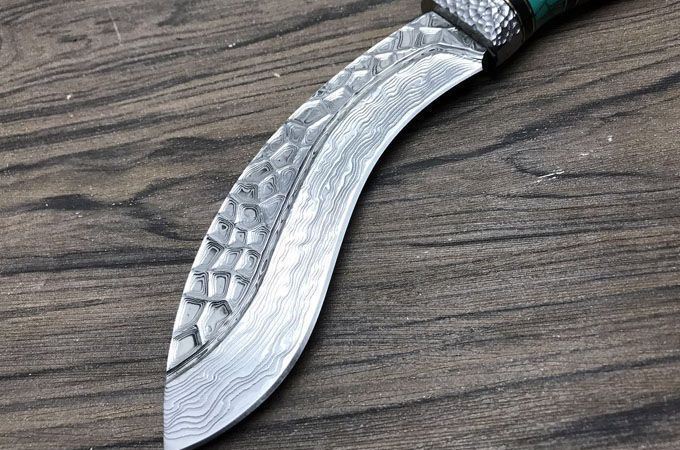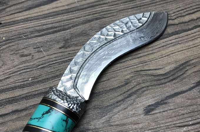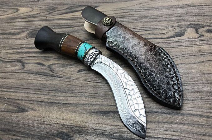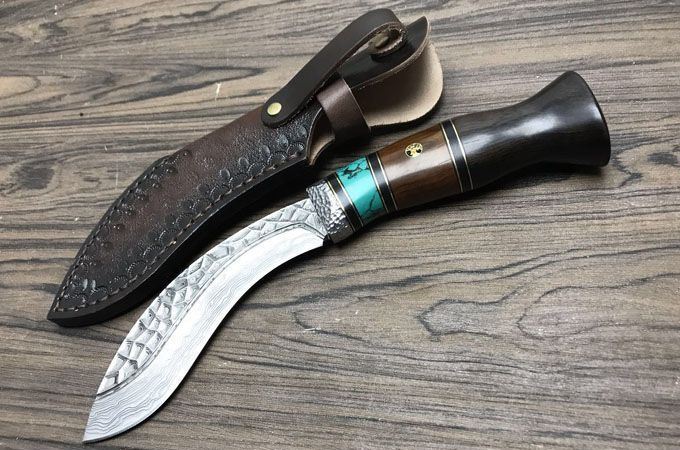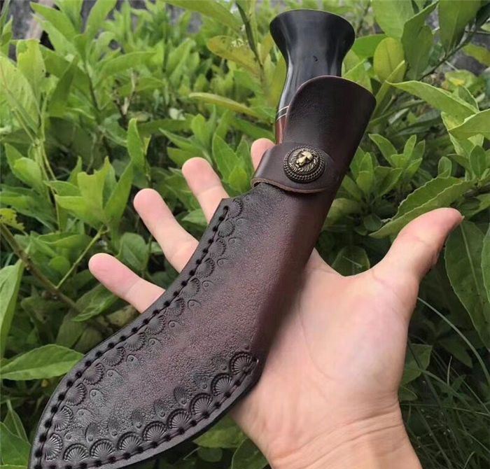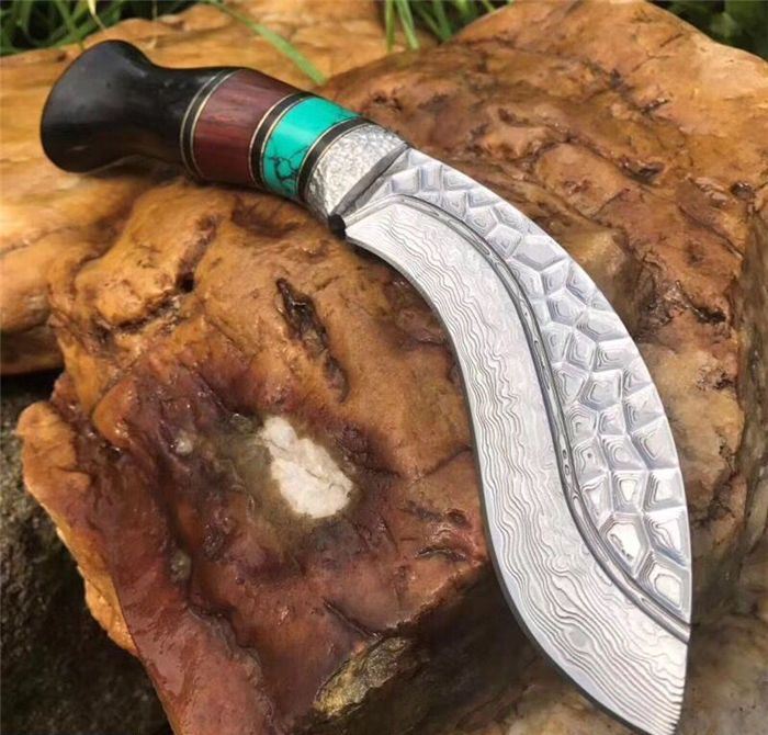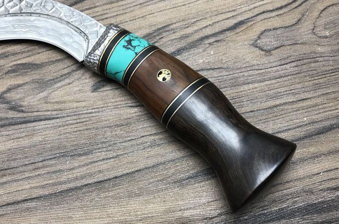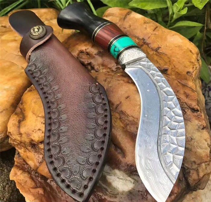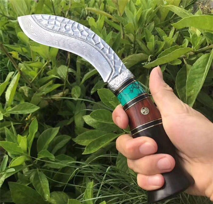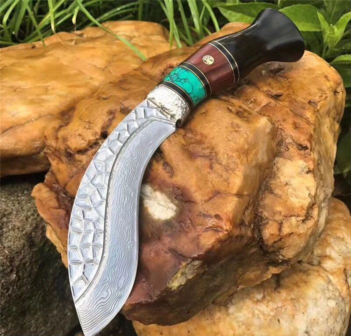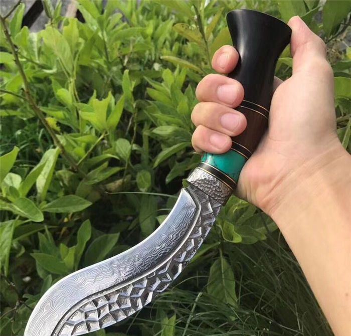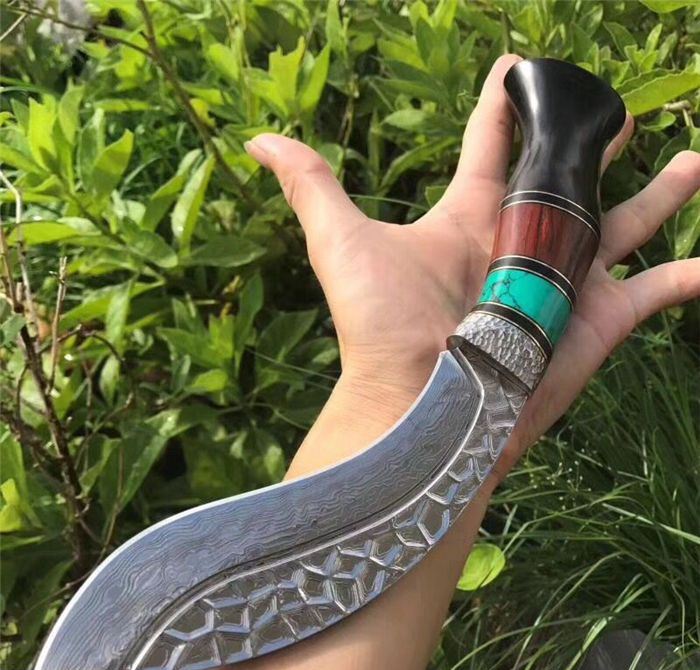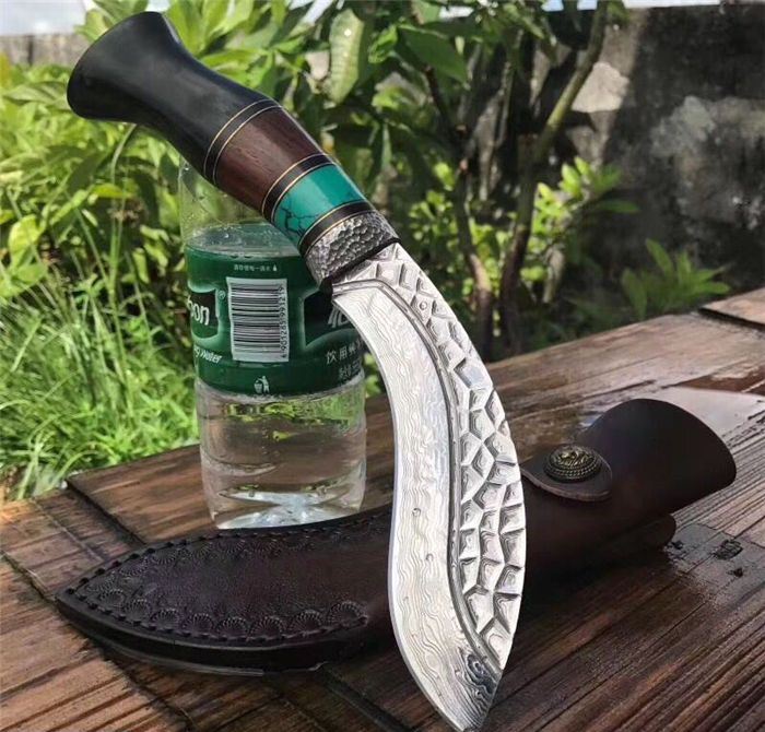 大马士革钢血刃狗腿刀 全长:26.5cm 刃长:14.5cm 柄长:12cm 刃厚:4.8cm 刃宽: 4.cm 刃材: 大马士革钢 柄材: 钢头+蓝松石黑檀木 硬度: 59HRC 净重:450克(含包装) 其他:皮套