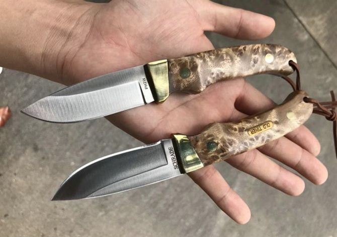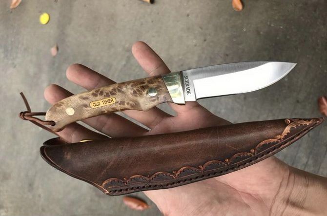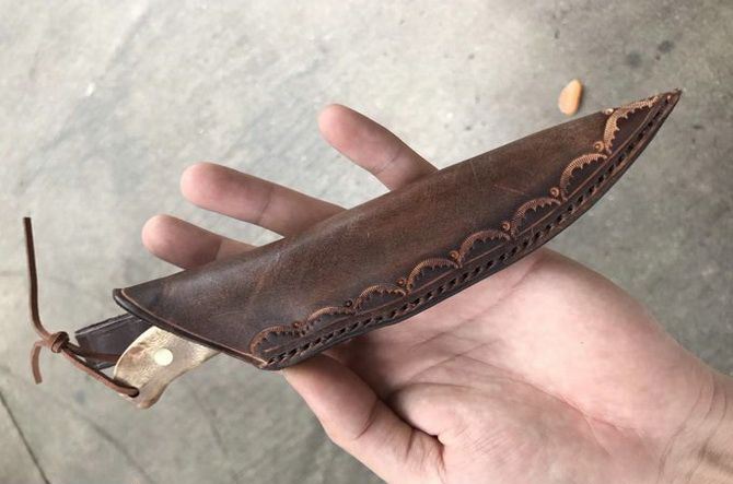 白影小猎刀 总长:17.5cm 刃长:6.5cm 刃厚:3mm 刃宽:2.5cm 钢材:440C钢 硬度:58-59HRC,真空热处理 柄材:进口白影 皮套:进口植鞣皮,纯手工缝线雕花