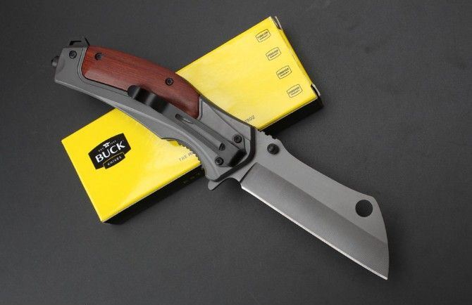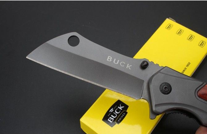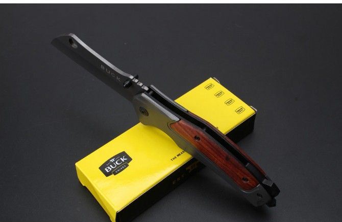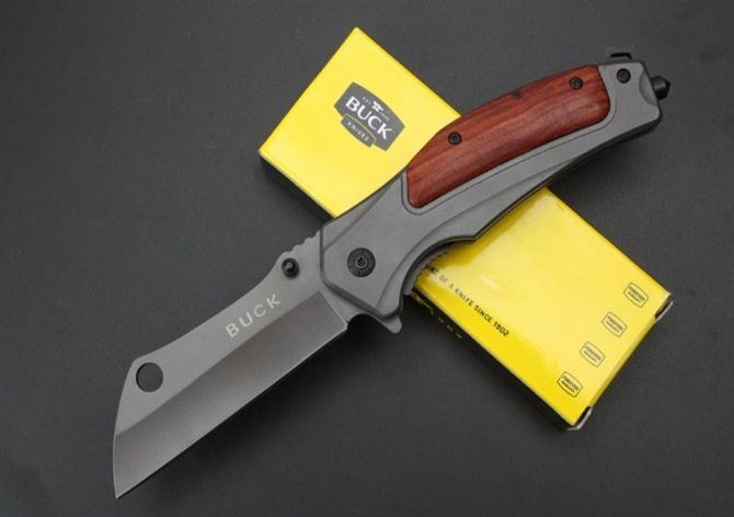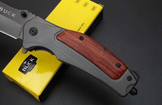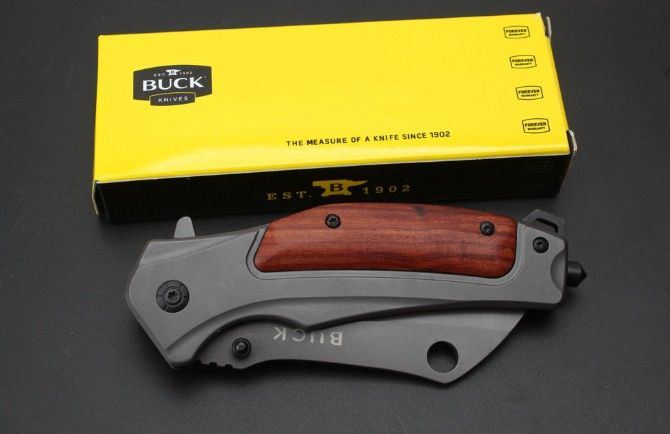 巴克DA107快开折刀 全 长:20.3cm 刃 长:8.5cm 柄 长:11.9cm 刃 宽:3.0cm 刃 厚:0.28cm 刃 材:5Cr15Mov 重 量:211g(含包装) 硬 度:58HRC 表 面:灰钛 柄 材:钢+酸枝木. 锁 型:侧锁 其 他:彩盒