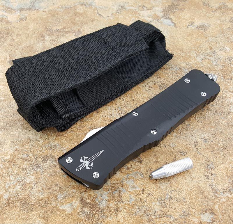 Microtech微技术直跳伤齿龙梳子 全长:24CM 刃长:9.6CM 柄长:14.6CM 刃材料:440 刃型:Edge 刃表面:缎光面,CNC磨 柄材料:T6061航空铝,硬质氧化 重量:160g 刀鞘:战术尼龙套剑标logo