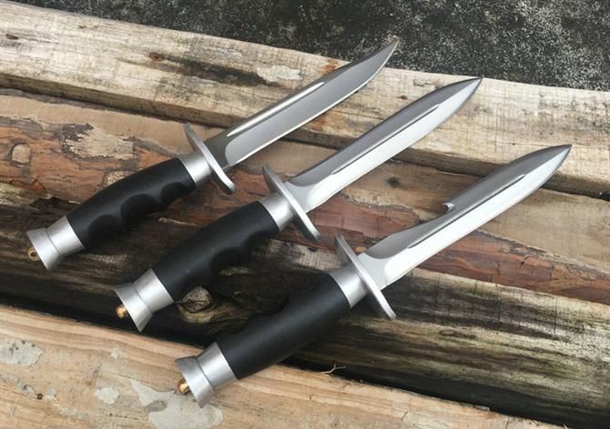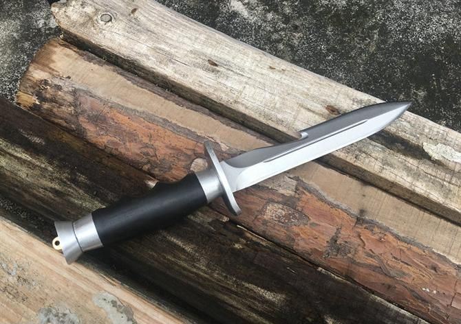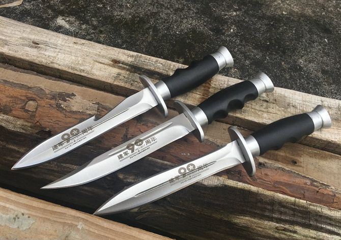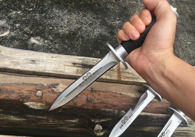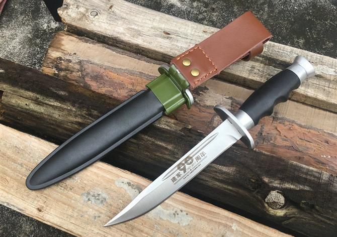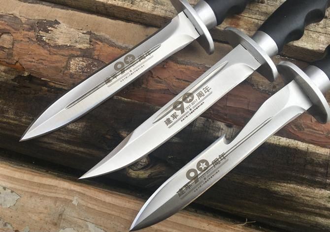 90周年65式伞兵刀(单刃和双刃) 全长:26cm 刃长:14cm 刃厚:0.45cm 刃宽:2.1cm 刃材:7铬17高级不锈钢 柄材:刀身贯穿刀柄,龙骨结构,为减轻装备重量,刀柄采用了航空铝材以及ABS工程塑料 硬度:58HRC