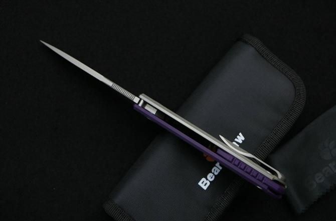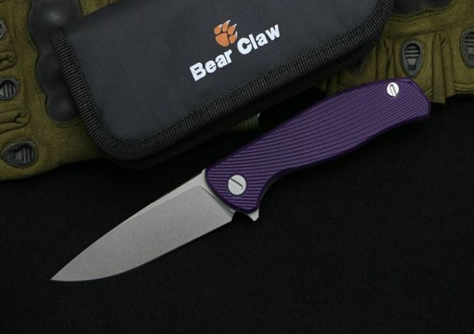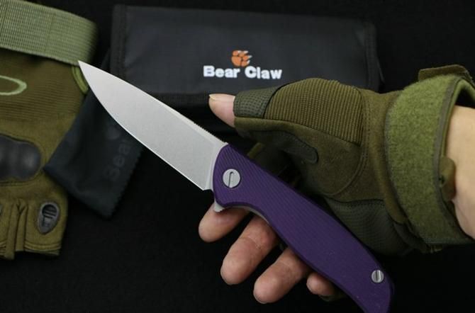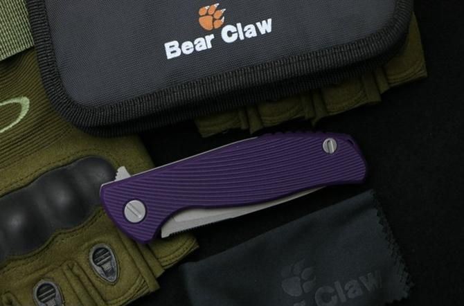 熊爪Hati95倒钩折刀 总长:222毫米 刀片长度:95 mm 手柄长度:127毫米 刀片厚度:4mm 刀片宽度:28.5毫米 刀刃:石洗 系统:陶瓷球轴承双排 硬度:59-60HRC 净重:117-118克 刀片材质:D2(100%实数D2,可以测试) 手柄材质:G10 + TC4钛,数控切割,成型工艺,减轻重量。 手柄表面:石洗