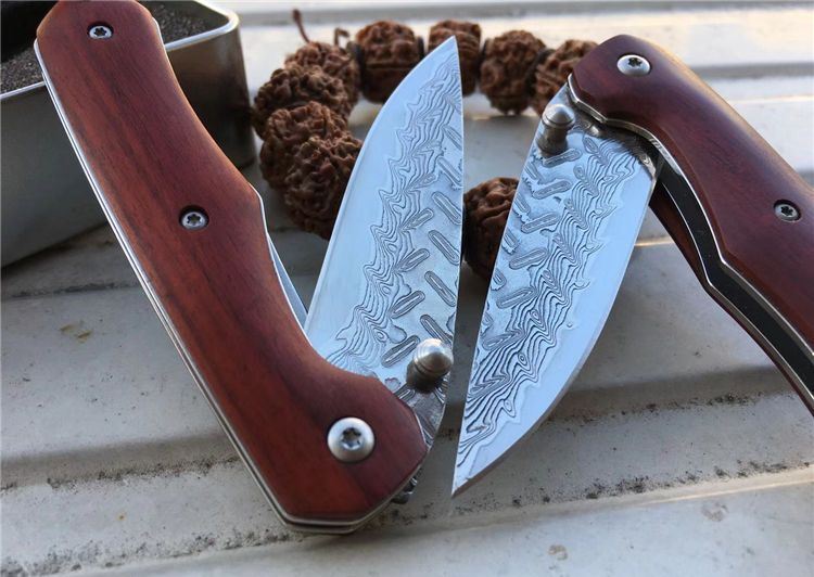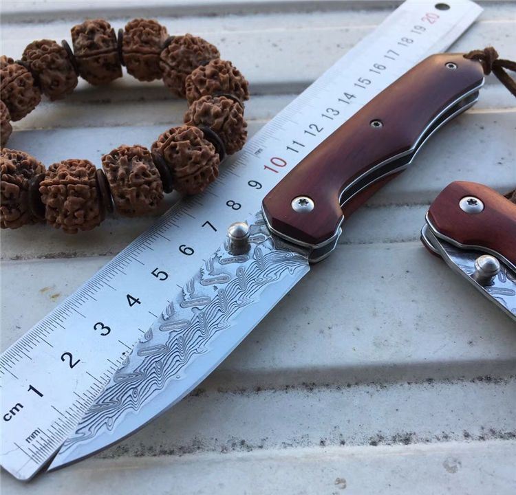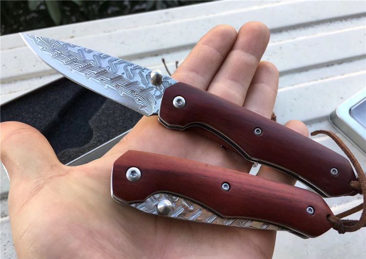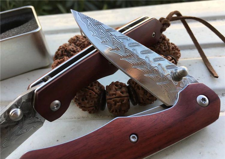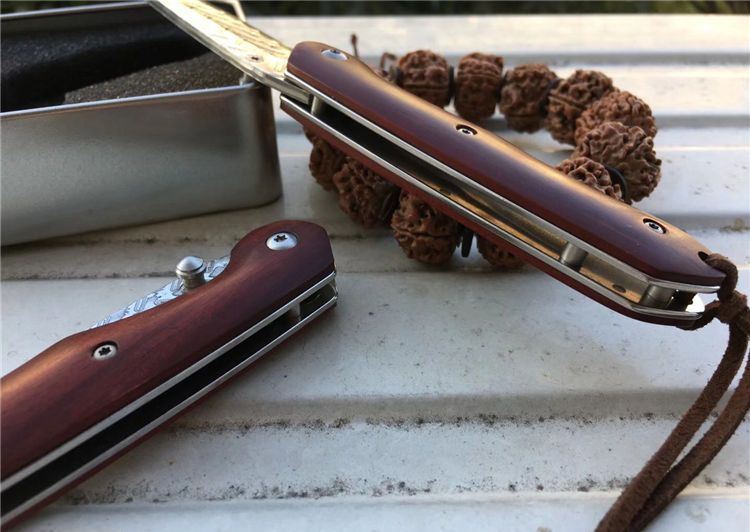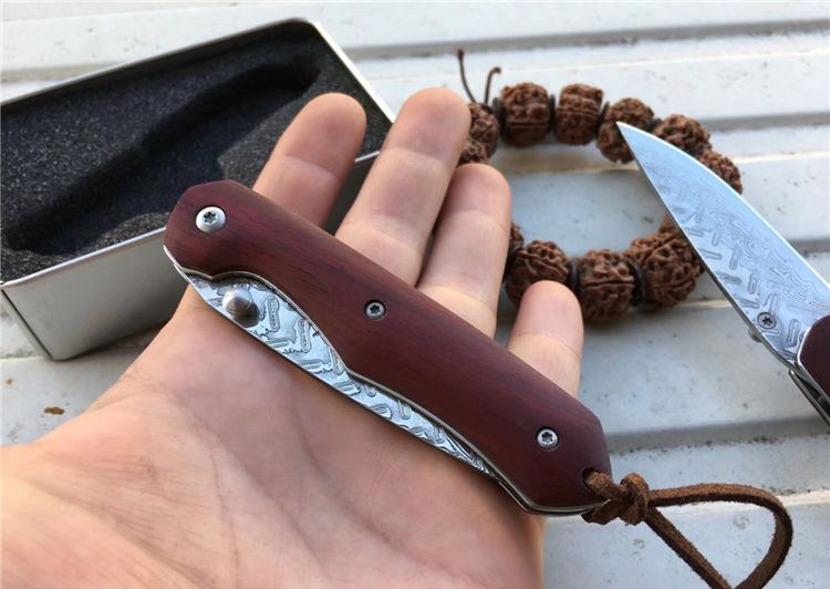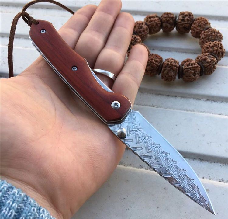 夜鹰大马士革折刀 全长:17cm 刃长:7.5cm 刃厚:2.5mm 刃宽:2.1cm 闭合:9.5cm 硬度:59HRC 裸刀克重:70g