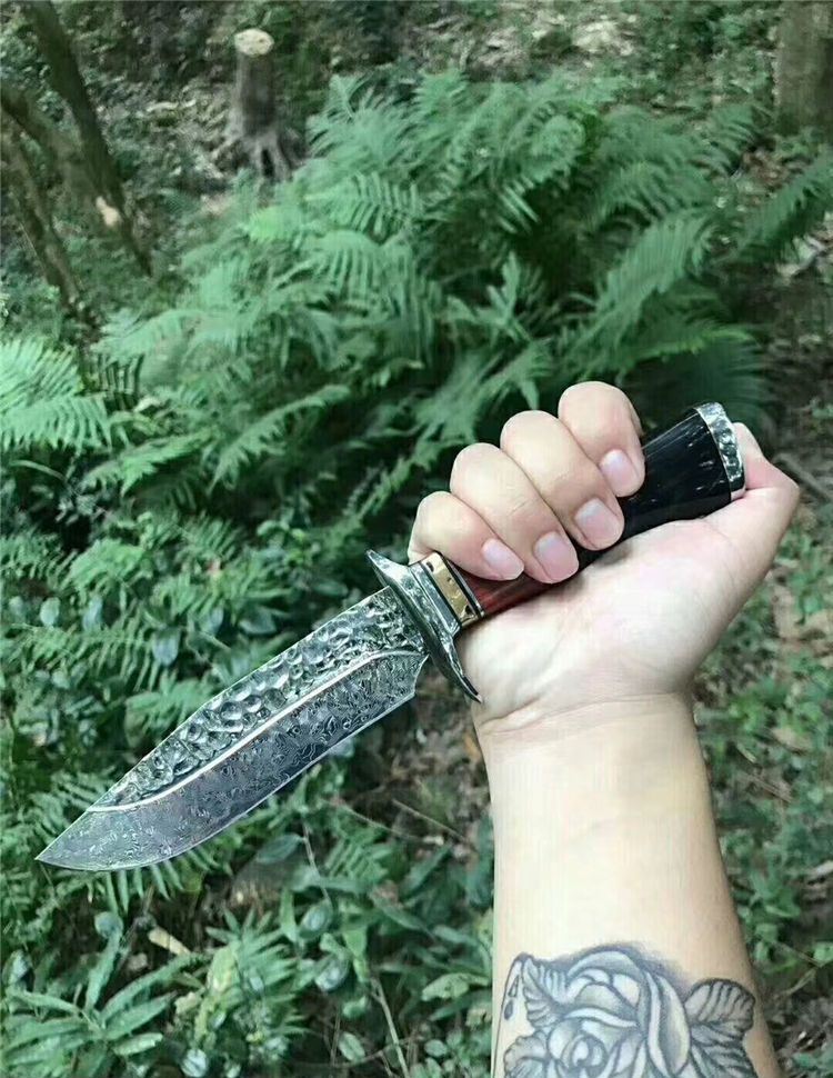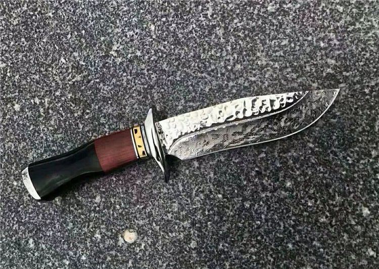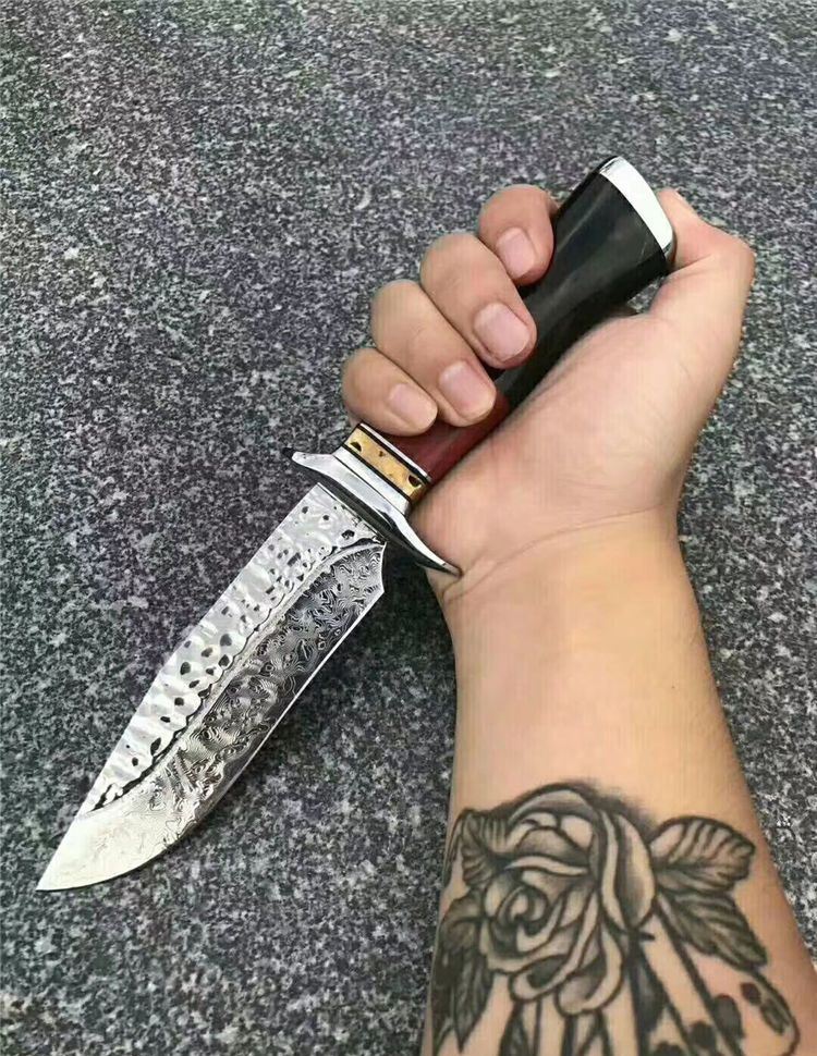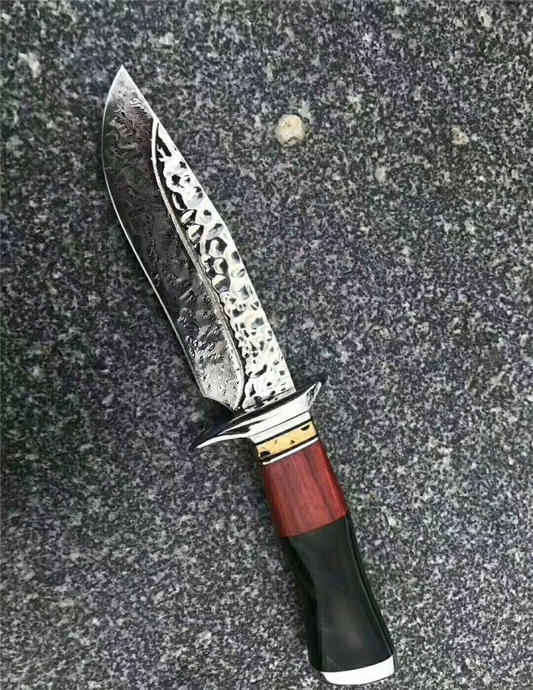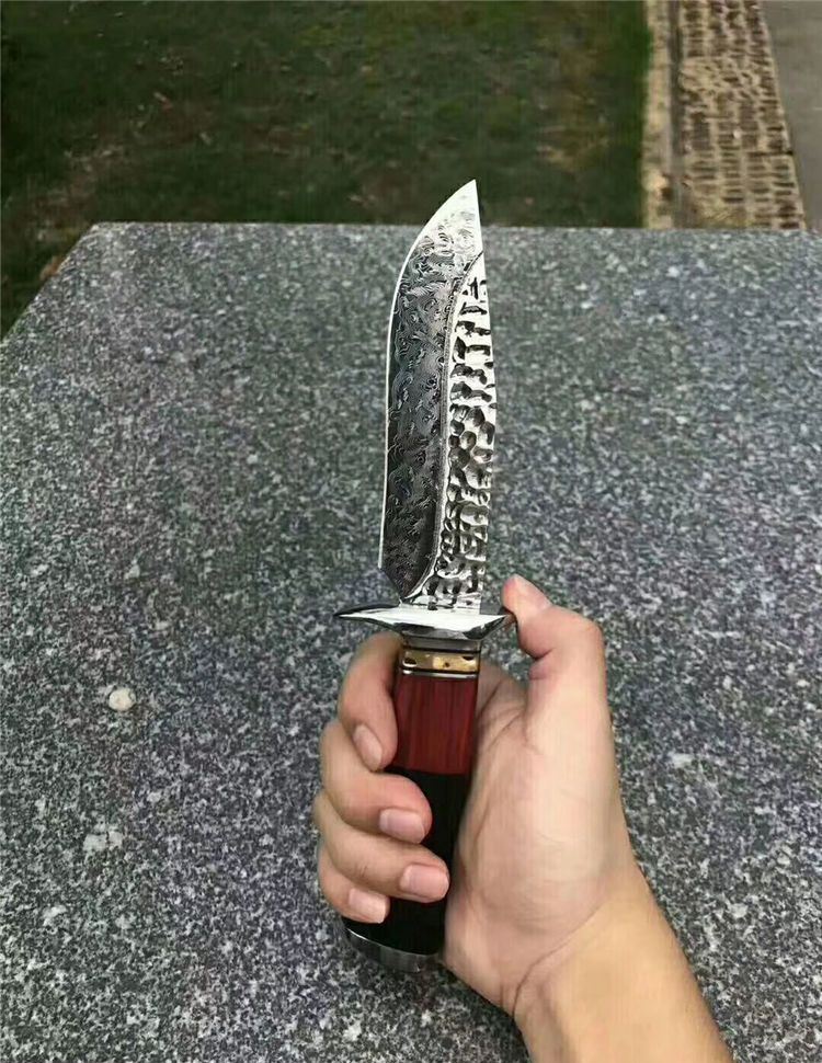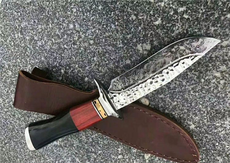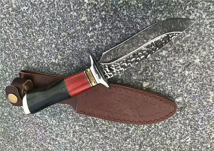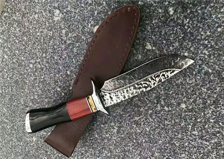 猛将大马士革猎刀 全 长: 23.8cm 刃 长: 12.2cm 柄 长: 11.6cm 刃 厚: 4.0mm 刃 宽: 3.3cm 刃 材: 进口Vg10大马士革钢 硬 度: 58-60HRC 重 量: 约360克(含包装) 表 面: 锻打吉祥如意花纹原色 柄 材: 黑牛角+红科檀木+黄铜+不锈钢 配 送:高级礼品盒+手工皮套