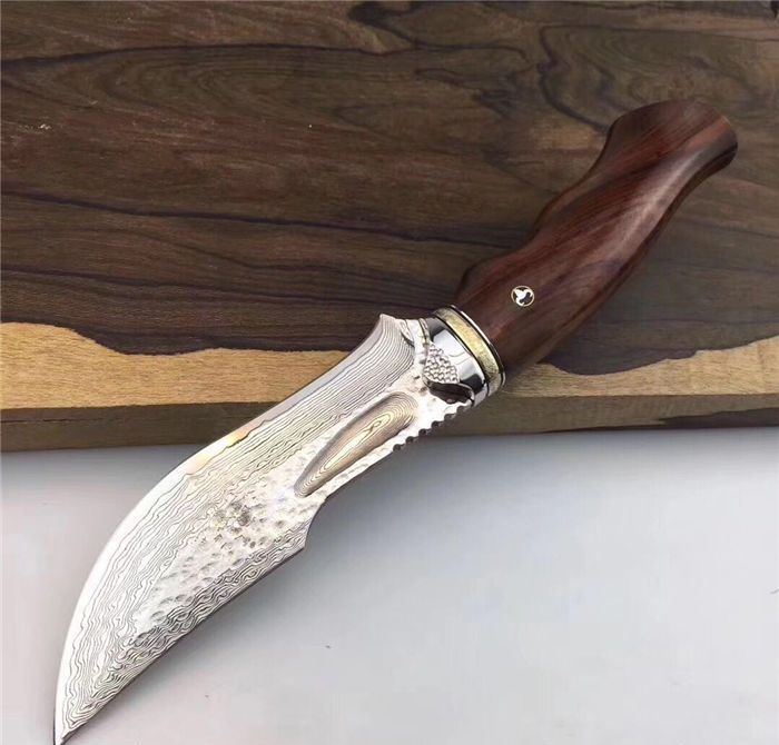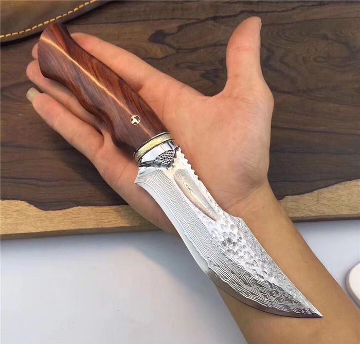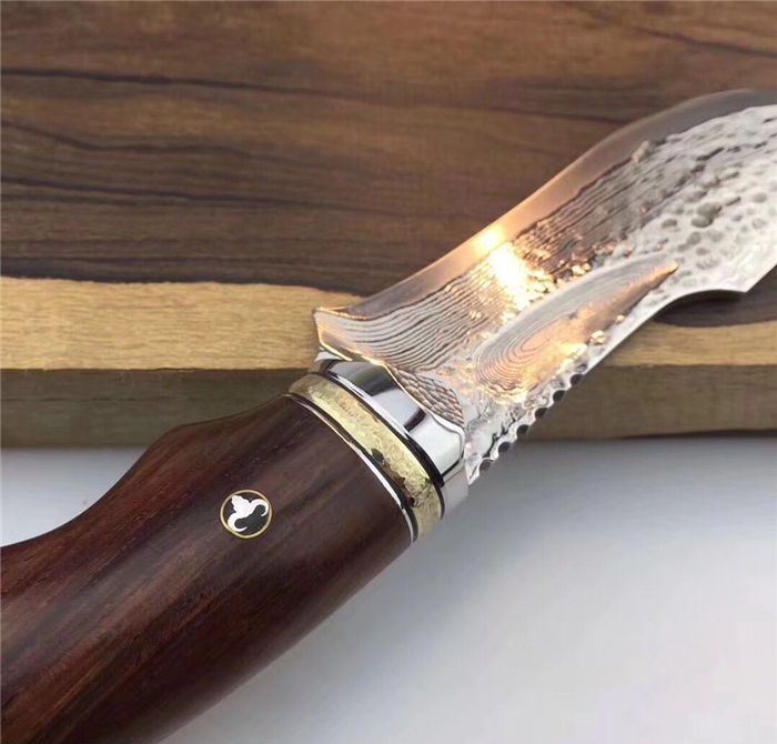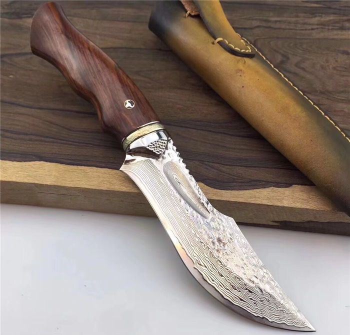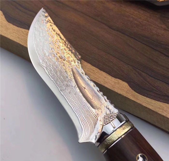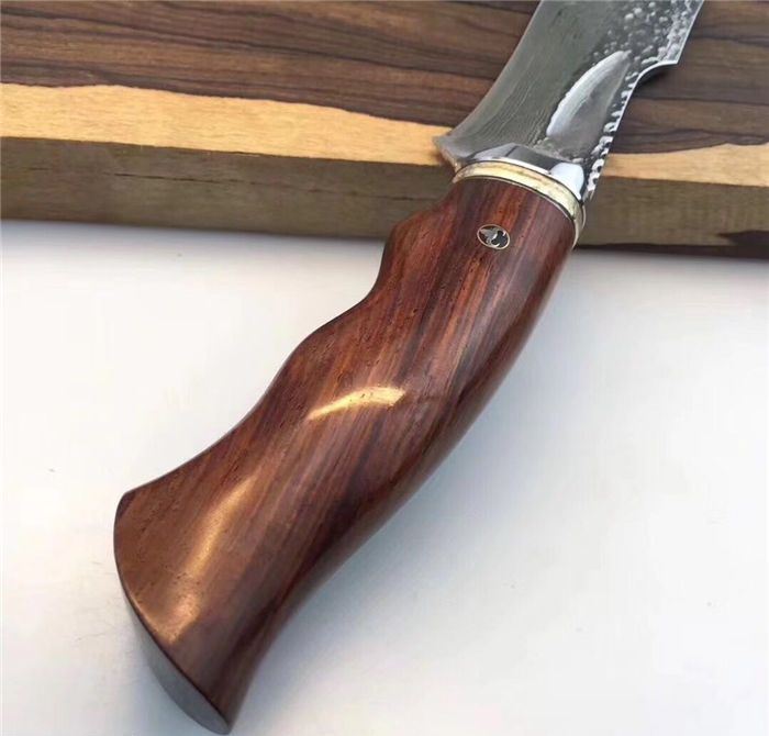 牛勇士大马士革直刀 全长:225mm 刃长:120mm 刃厚:4.0mm 刃宽:35mm 柄长:110mm 刃材:进口VG10芯层大马士革钢 净重:约170g 硬度:58-59hrc 柄材:进口黄檀木 皮套:手工进口植鞣牛皮鞘 包装:高档礼盒