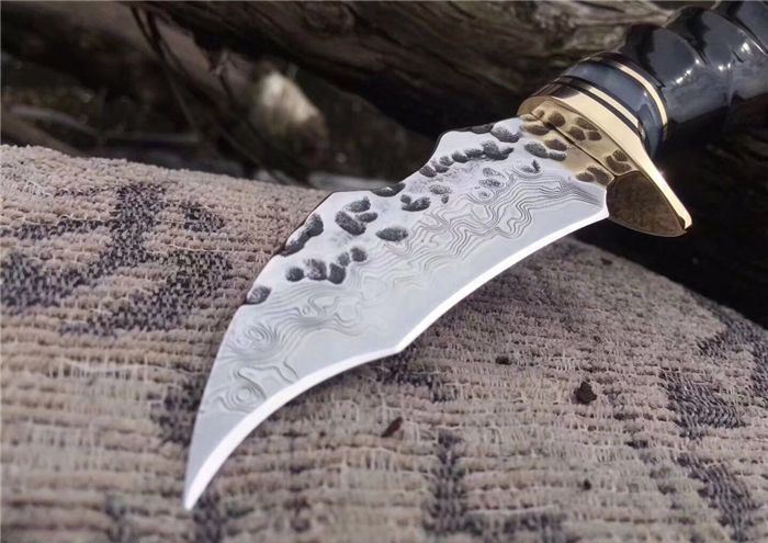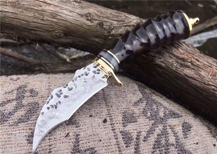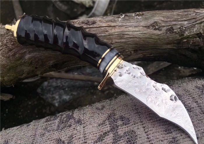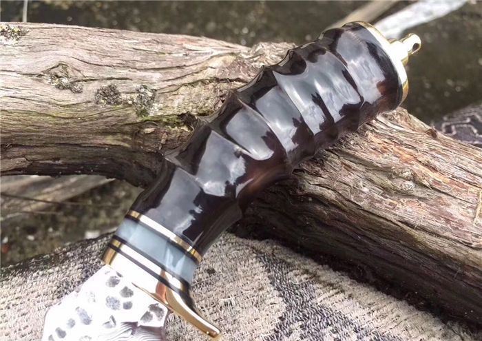 羊角迷你秃鹰大马士革直刀 全长:14.1cm 刃长:6.5cm 刃宽:1.6cm(最宽处) 柄长:7.1cm 硬度:58-60HRC 刃厚:0.42cm 重量:约161克(含包装) 表面:纯手工制造锻打祥云花纹原色 刃 材:正品大马士革钢 柄 材:天然羊角+不锈钢+红彩石+白钢+黑G10 赠 送:精美礼品盒+牛皮绳