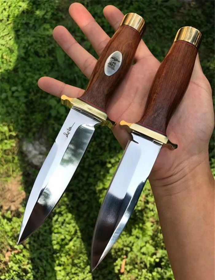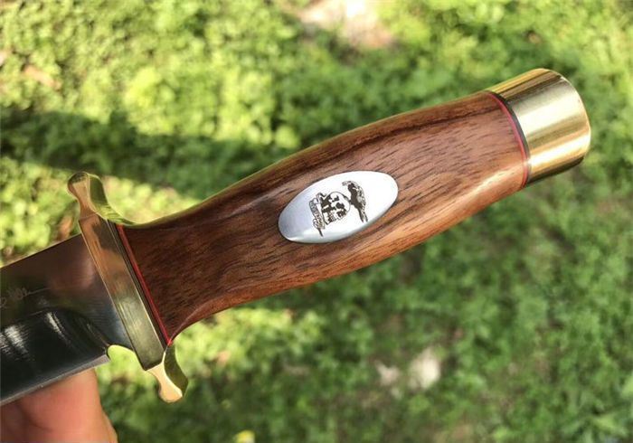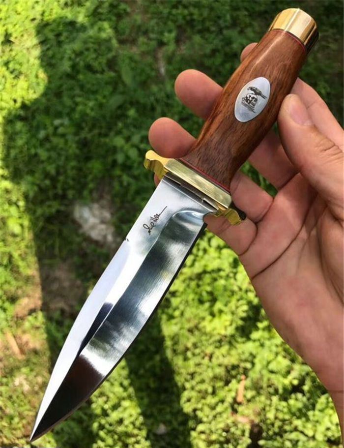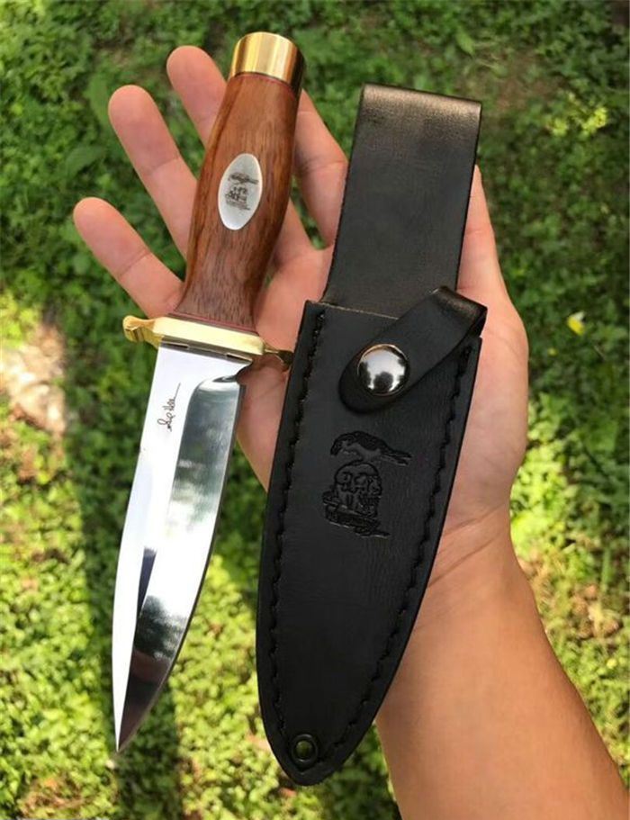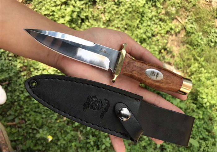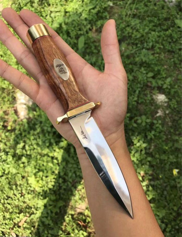 敢死队荒原骑士小牙签短版直刀 总长:22cm 刃长:10.6cm 刃厚:4mm 刃宽:2.7cm 钢材:440A钢(此钢性能耐绣性与锋利度保持性好,是国外广泛用作刀具使用钢材) 硬度:58HRC,真空热处理 柄材:进口木(红酸枝)+纯黄铜 档手:纯黄铜+钢纸 皮套:真牛皮套 包装:黑色手工盒子