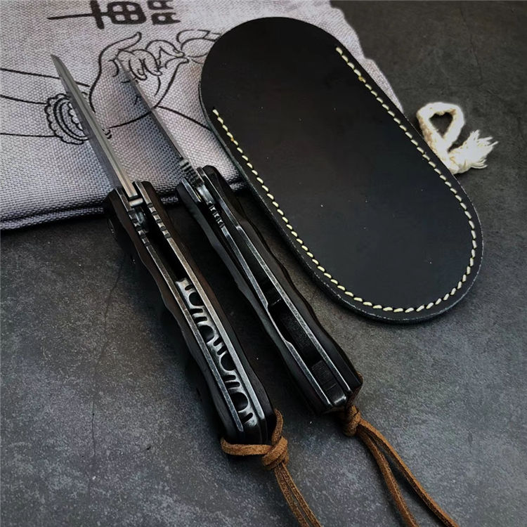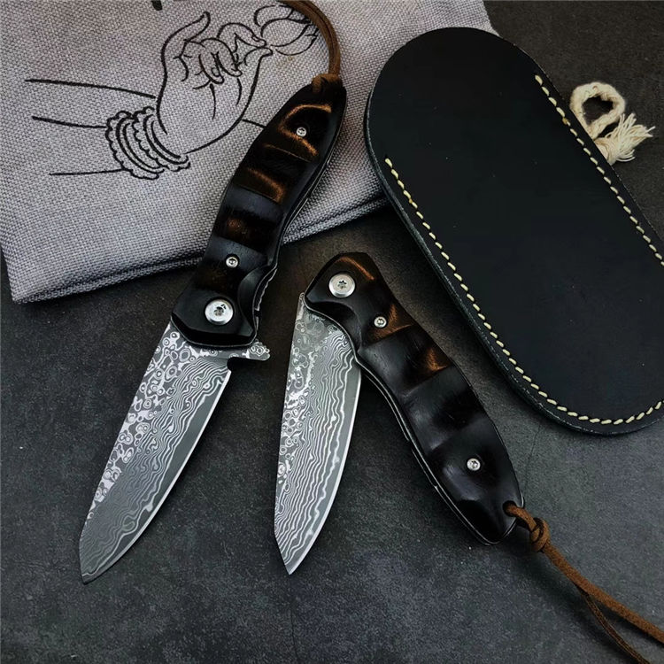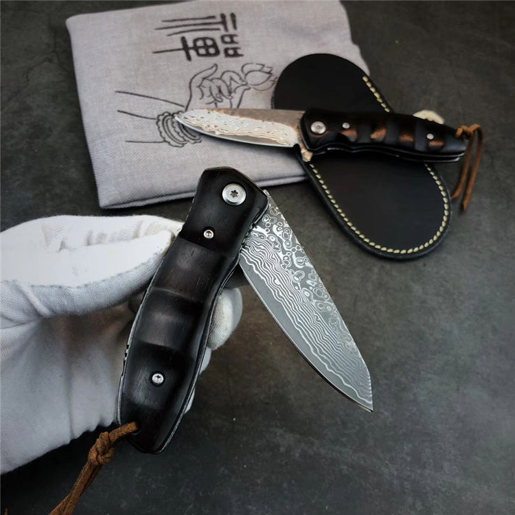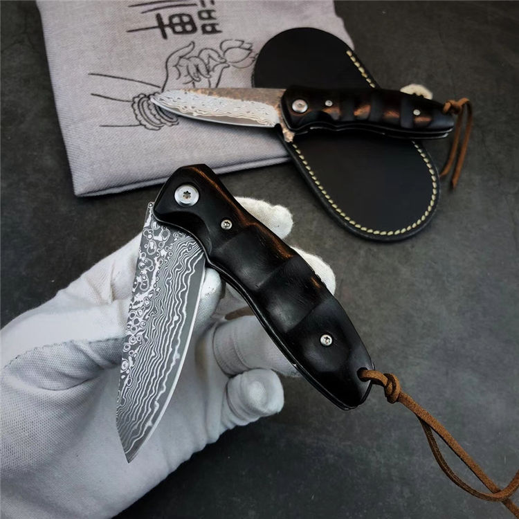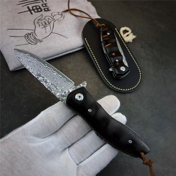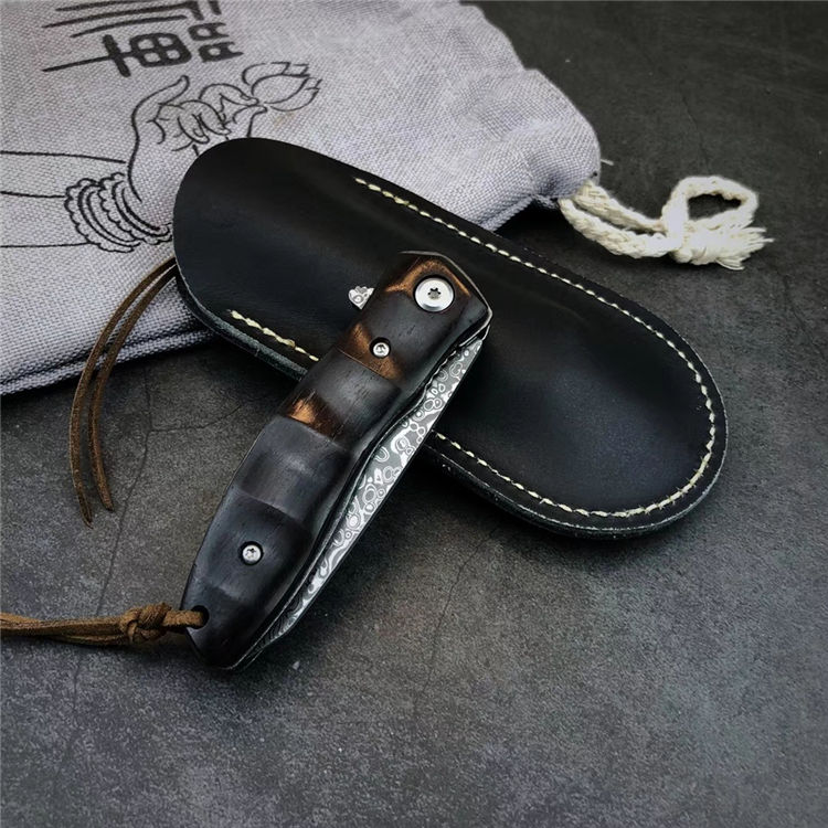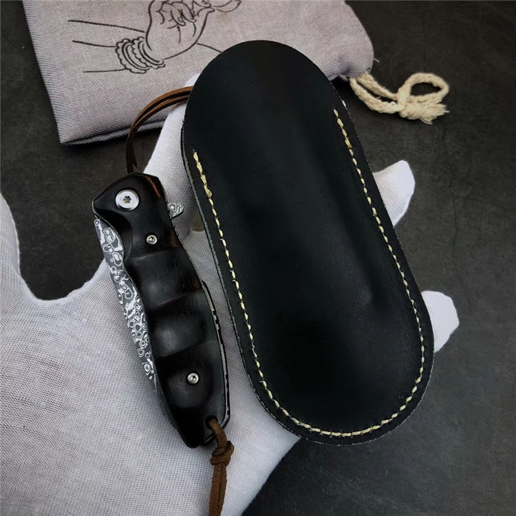 托马斯大马士革德国战车折刀 全 长:16.1cm 刃 长:7.2cm 柄 长:8.9cm 刃 厚:3.6mm 刃 宽:2.1cm 刃 材:进口大马士革钢 硬 度:58-60HRC 重 量:约120克(含包装) 表 面:锻打雨滴水波花纹原色 柄 材:北非紫檀木+石洗不锈钢+铜轴 配 送:高级礼品盒+标配U型皮套+牛皮绳+彩珠子