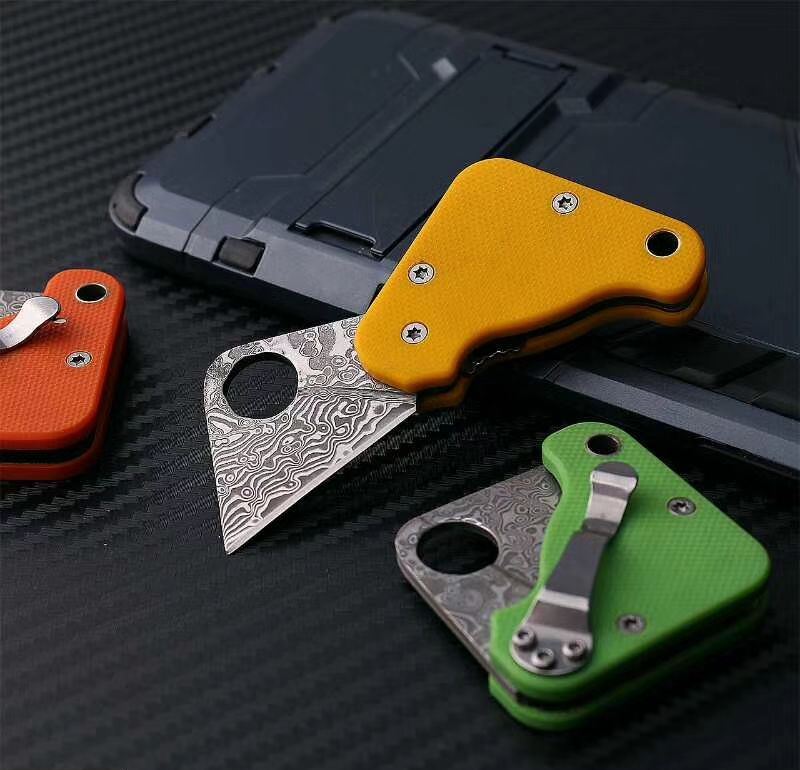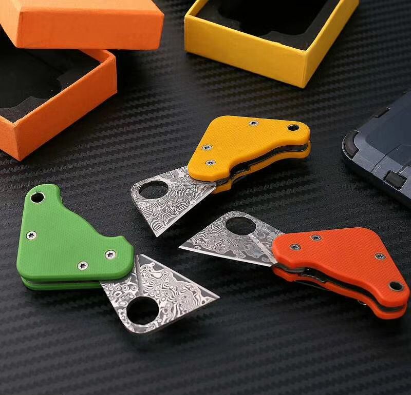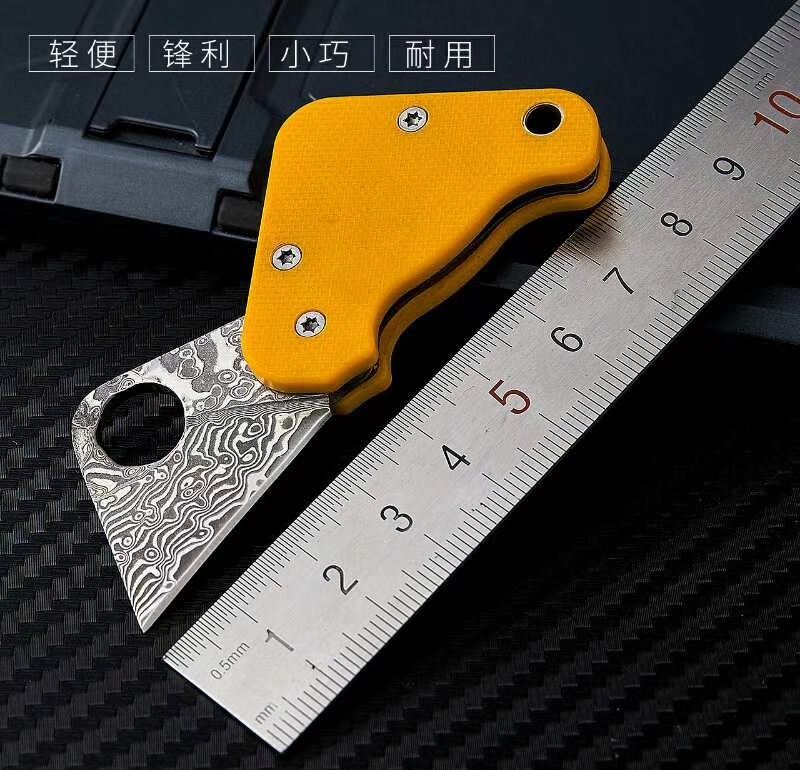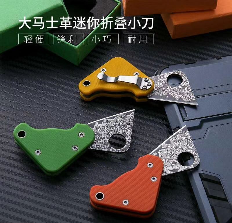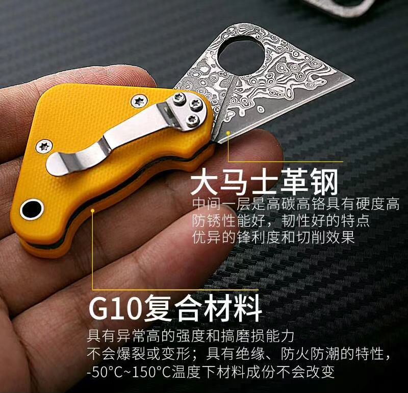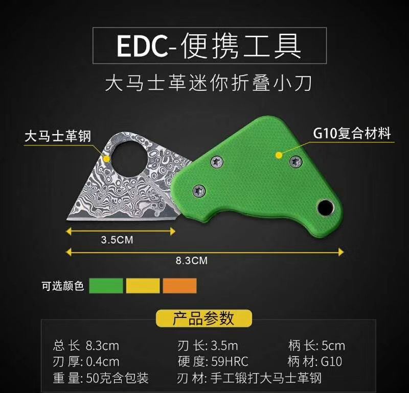 大马士革迷你折叠小刀 全长:8.3CM 刃长:3.5CM 柄长:5CM 刀厚:0.4CM 硬度:59HRC 柄材:G10 重量:50克含包装 钢材:大马士革 刃材:手工锻打大马士革钢